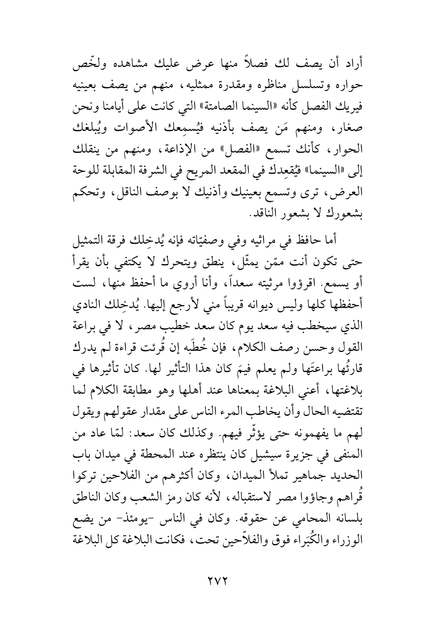 أما حافظ في مراثيه وفي وصفيّاته فإنه يُدخِلك فرقة التمثيل حتى تكون أنت ممّن يمثّل، ينطق ويتحرك لا يكتفي بأن يقرأ أو يسمع. اقرؤوا مرثيته سعداً، وأنا أروي ما أحفظ منها، لست أحفظها كلها وليس ديوانه قريباً مني لأرجع إليها. يُدخِلك النادي الذي سيخطب فيه سعد يوم كان سعد خطيب مصر، لا في براعة القول وحسن رصف الكلام، فإن خُطَبه إن قُرئت قراءة لم يدرك قارئُها براعتَها ولم يعلم فيمَ كان هذا التأثير لها. كان تأثيرها في بلاغتها، أعني البلاغة بمعناها عند أهلها وهو مطابقة الكلام لما تقتضيه الحال وأن يخاطب المرء الناس على مقدار عقولهم ويقول لهم ما يفهمونه حتى يؤثّر فيهم. وكذلك كان سعد: لمّا عاد من المنفى في جزيرة سيشيل كان ينتظره عند المحطة في ميدان باب الحديد جماهير تملأ الميدان، وكان أكثرهم من الفلاحين تركوا قُراهم وجاؤوا مصر لاستقباله، لأنه كان رمز الشعب وكان الناطق بلسانه المحامي عن حقوقه. وكان في الناس -يومئذ- من يضع الوزراء والكُبَراء فوق والفلاّحين تحت، فكانت البلاغة كل البلاغة