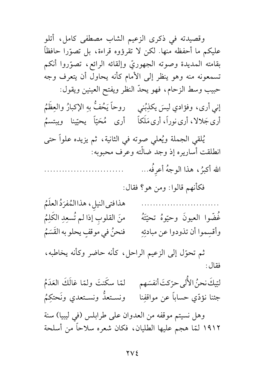 وهل نسيتم موقفه من العدوان على طرابلس (في ليبيا) سنة 1912 لمّا هجم عليها الطليان، فكان شعره سلاحاً من أسلحة