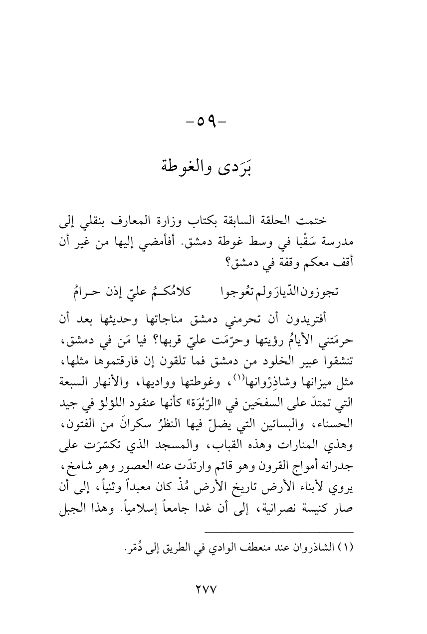 ختمت الحلقة السابقة بكتاب وزارة المعارف بنقلي إلى مدرسة سَقْبا في وسط غوطة دمشق. أفأمضي إليها من غير أن أقف معكم وقفة في دمشق؟
