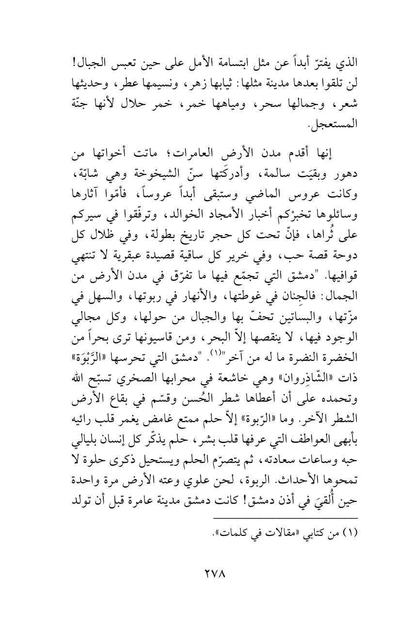 إنها أقدم مدن الأرض العامرات؛ ماتت أخواتها من دهور وبقيَت سالمة، وأدركَتها سنّ الشيخوخة وهي شابّة، وكانت عروس الماضي وستبقى أبداً عروساً، فأمّوا آثارها وسائلوها تخبرْكم أخبار الأمجاد الخوالد، وترفّقوا في سيركم على ثُراها، فإنّ تحت كل حجر تاريخ بطولة، وفي ظلال كل دوحة قصة حب، وفي خرير كل ساقية قصيدة عبقرية لا تنتهي قوافيها. "دمشق التي تجمّع فيها ما تفرّق في مدن الأرض من الجمال: فالجِنان في غوطتها، والأنهار في ربوتها، والسهل في مزّتها، والبساتين تحفّ بها والجبال من حولها، وكل مجالي الوجود فيها، لا ينقصها إلاّ البحر، ومن قاسيونها ترى بحراً من الخضرة النضرة ما له من آخر" (¬1). "دمشق التي تحرسها «الرَّبْوَة» ذات «الشّاذِروان» وهي خاشعة في محرابها الصخري تسبّح الله وتحمده على أن أعطاها شطر الحُسن وقسّم في بقاع الأرض الشطر الآخر. وما «الرّبوة» إلاّ حلم ممتع غامض يغمر قلب رائيه بأبهى العواطف التي عرفها قلب بشر، حلم يذكّر كل إنسان بليالي حبه وساعات سعادته، ثم يتصرّم الحلم ويستحيل ذكرى حلوة لا تمحوها الأحداث. الربوة، لحن علوي وعته الأرض مرة واحدة حين أُلقيَ في أذن دمشق! كانت دمشق مدينة عامرة قبل أن تولد