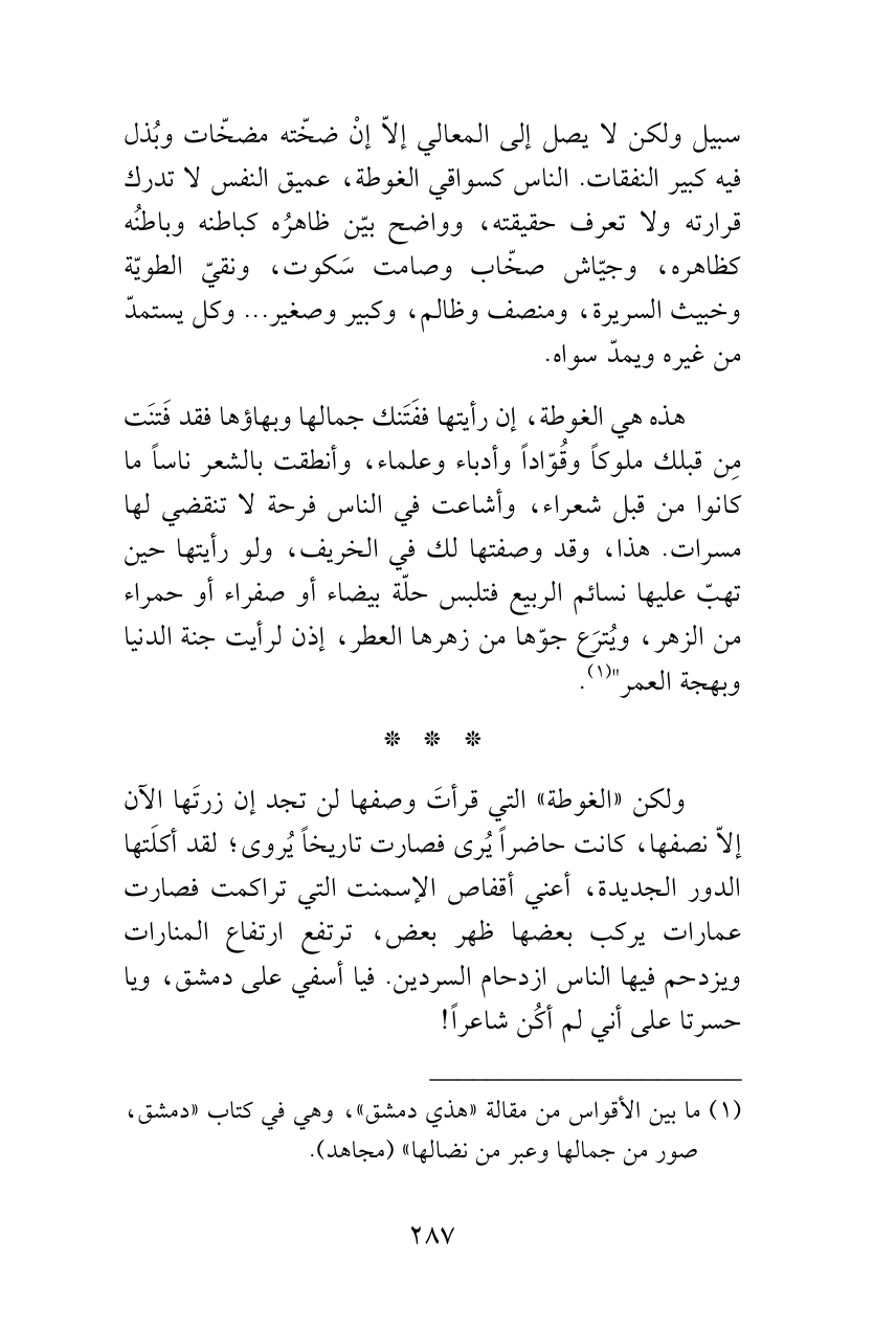 ولكن «الغوطة» التي قرأتَ وصفها لن تجد إن زرتَها الآن إلاّ نصفها، كانت حاضراً يُرى فصارت تاريخاً يُروى؛ لقد أكلَتها الدور الجديدة، أعني أقفاص الإسمنت التي تراكمت فصارت عمارات يركب بعضها ظهر بعض، ترتفع ارتفاع المنارات ويزدحم فيها الناس ازدحام السردين. فيا أسفي على دمشق، ويا حسرتا على أني لم أكُن شاعراً!