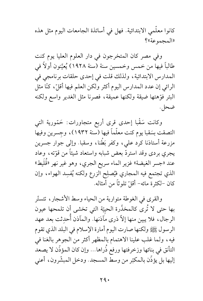 وفي مصر كان المتخرجون في دار العلوم العليا يوم كنت طالباً فيها من خمس وخمسين سنة (سنة 1928) يُعيَّنون أولاً في المدارس الابتدائية، ولذلك قلت في إحدى حلقات برنامجي في الرائي إن عدد المدارس اليوم أكثر ولكن العلم فيها أقلّ، كنّا مثل البئر فوّهتها ضيقة ولكنها عميقة، فصرنا مثل الغدير واسع ولكنه ضحل.