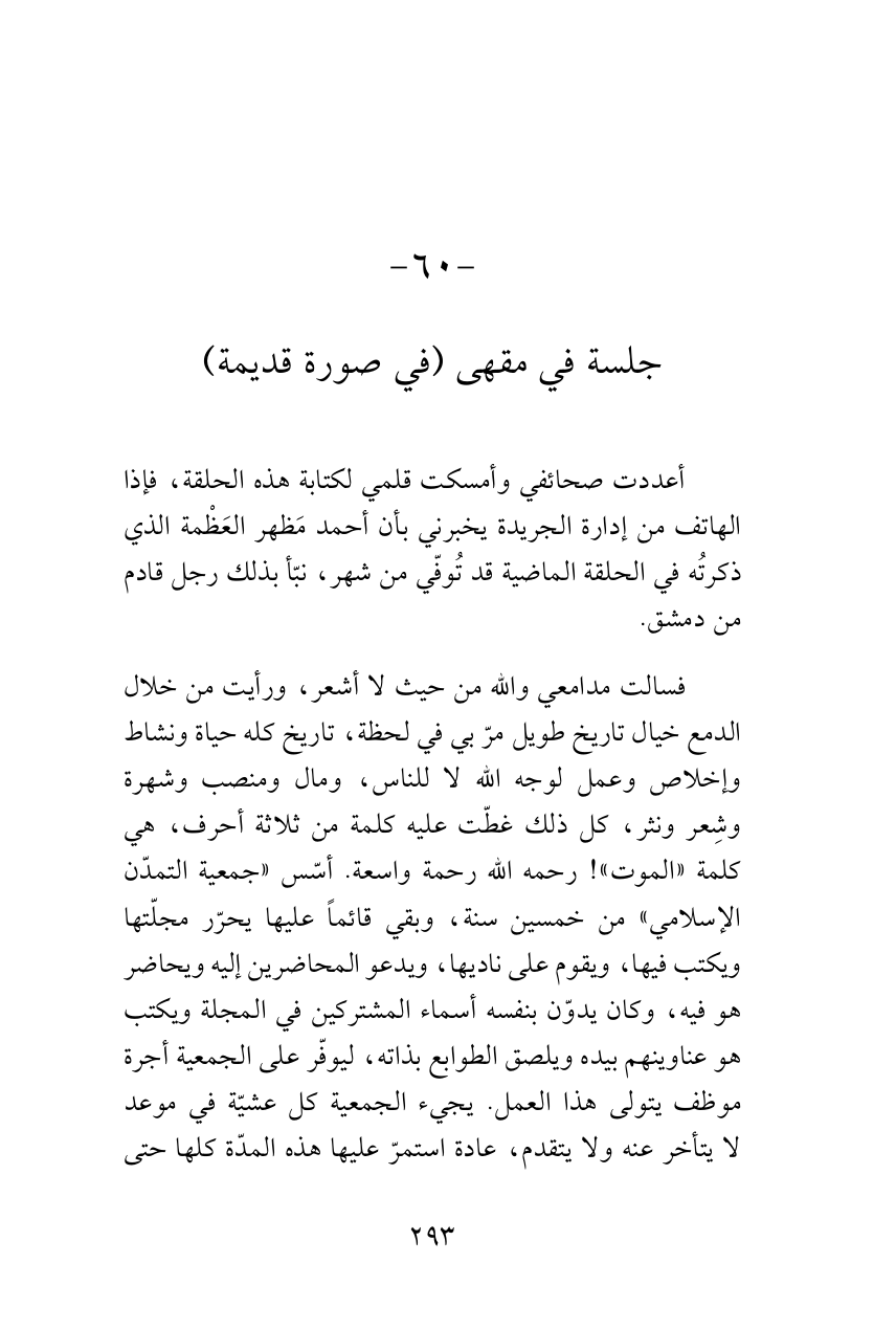 أعددت صحائفي وأمسكت قلمي لكتابة هذه الحلقة، فإذا الهاتف من إدارة الجريدة يخبرني بأن أحمد مَظهر العَظْمة الذي ذكرتُه في الحلقة الماضية قد تُوفّي من شهر، نبّأ بذلك رجل قادم من دمشق.