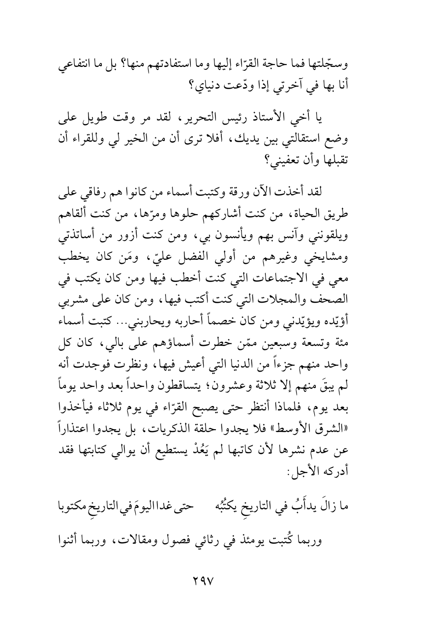 لقد أخذت الآن ورقة وكتبت أسماء من كانوا هم رفاقي على طريق الحياة، من كنت أشاركهم حلوها ومرّها، من كنت ألقاهم ويلقونني وآنس بهم ويأنسون بي، ومن كنت أزور من أساتذتي ومشايخي وغيرهم من أولي الفضل عليّ، ومَن كان يخطب معي في الاجتماعات التي كنت أخطب فيها ومن كان يكتب في الصحف والمجلات التي كنت أكتب فيها، ومن كان على مشربي أؤيّده ويؤيّدني ومن كان خصماً أحاربه ويحاربني ... كتبت أسماء مئة وتسعة وسبعين ممّن خطرت أسماؤهم على بالي، كان كل واحد منهم جزءاً من الدنيا التي أعيش فيها، ونظرت فوجدت أنه لم يبقَ منهم إلا ثلاثة وعشرون؛ يتساقطون واحداً بعد واحد يوماً بعد يوم، فلماذا أنتظر حتى يصبح القرّاء في يوم ثلاثاء فيأخذوا «الشرق الأوسط» فلا يجدوا حلقة الذكريات، بل يجدوا اعتذاراً عن عدم نشرها لأن كاتبها لم يَعُدْ يستطيع أن يوالي كتابتها فقد أدركه الأجل: