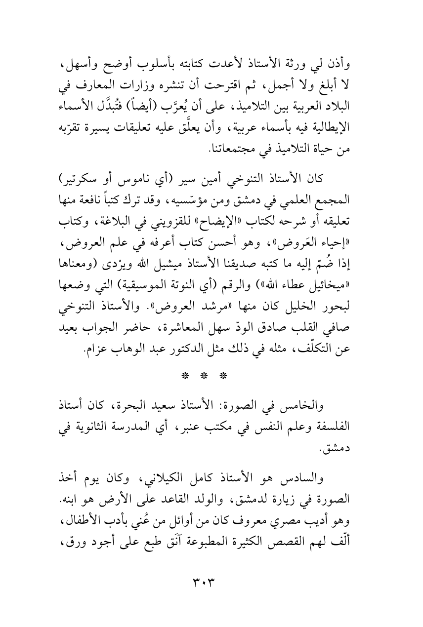 وأذن لي ورثة الأستاذ لأعدت كتابته بأسلوب أوضح وأسهل، لا أبلغ ولا أجمل، ثم اقترحت أن تنشره وزارات المعارف في البلاد العربية بين التلاميذ، على أن يُعرَّب (أيضاً) فتُبدَّل الأسماء الإيطالية فيه بأسماء عربية، وأن يعلَّق عليه تعليقات يسيرة تقرّبه من حياة التلاميذ في مجتمعاتنا.