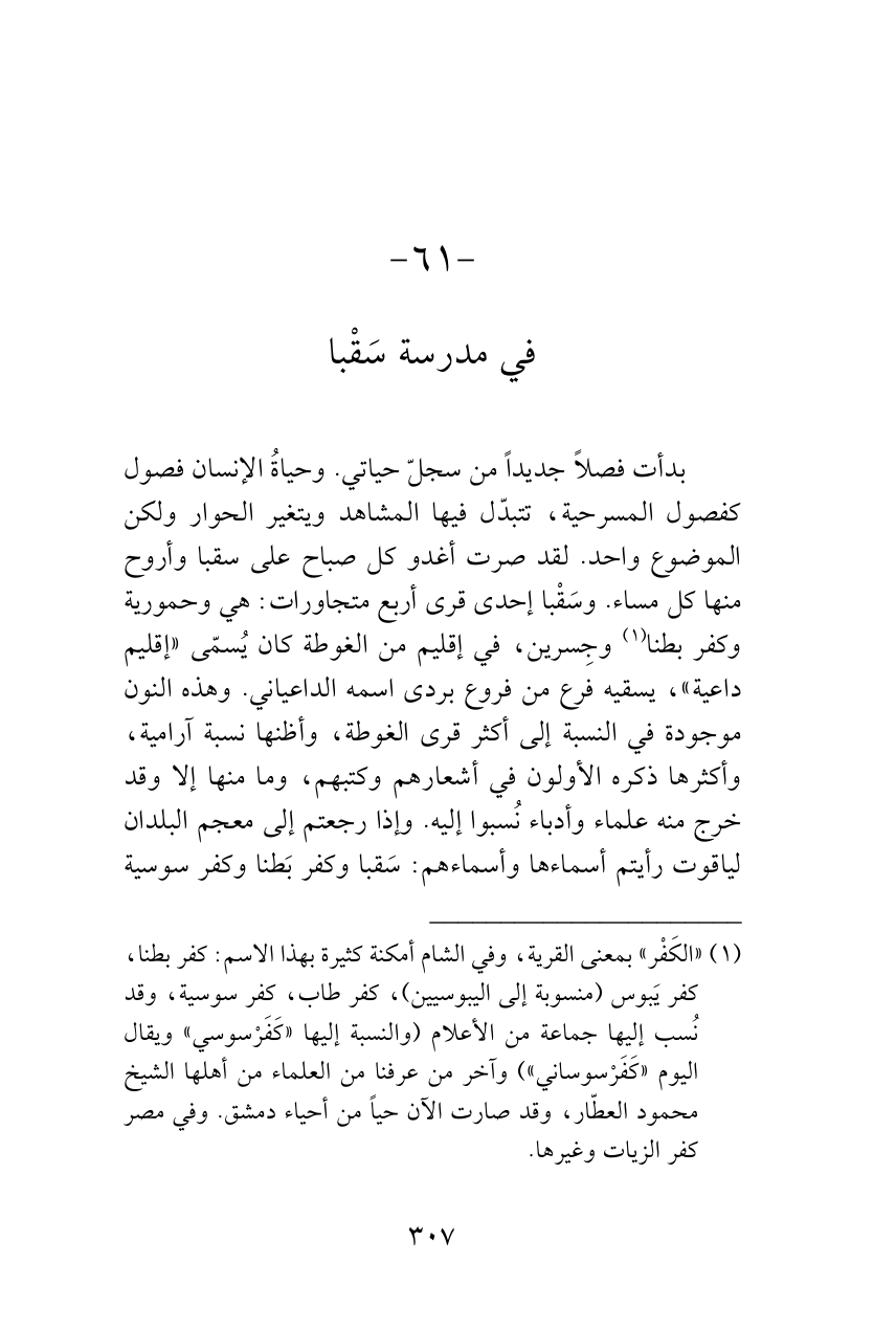 بدأت فصلاً جديداً من سجلّ حياتي. وحياةُ الإنسان فصول كفصول المسرحية، تتبدّل فيها المشاهد ويتغير الحوار ولكن الموضوع واحد. لقد صرت أغدو كل صباح على سقبا وأروح منها كل مساء. وسَقْبا إحدى قرى أربع متجاورات: هي وحمورية وكفر بطنا (¬1) وجِسرين، في إقليم من الغوطة كان يُسمّى «إقليم داعية»، يسقيه فرع من فروع بردى اسمه الداعياني. وهذه النون موجودة في النسبة إلى أكثر قرى الغوطة، وأظنها نسبة آرامية، وأكثرها ذكره الأولون في أشعارهم وكتبهم، وما منها إلا وقد خرج منه علماء وأدباء نُسبوا إليه. وإذا رجعتم إلى معجم البلدان لياقوت رأيتم أسماءها وأسماءهم: سَقبا وكفر بَطنا وكفر سوسية