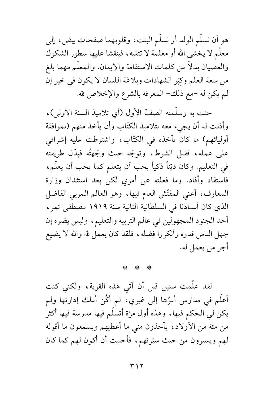 جئت به وسلّمته الصفّ الأول (أي تلاميذ السنة الأولى)، وأذنت له أن يجيء معه بتلاميذ الكتّاب وأن يأخذ منهم (بموافقة أوليائهم) ما كان يأخذه في الكتّاب، واشترطت عليه إشرافي على عمله، فقبل الشرط، وتوجّه حيث وجّهتُه فبدّل طريقته في التعليم. وكان ديّناً ذكياً يحب أن يتعلم كما يحب أن يعلّم، فاستفاد وأفاد. وما فعلته عن أمري لكن بعد استئذان وزارة المعارف، أعني المفتّش العام فيها، وهو العالم المربي الفاضل الذي كان أستاذنا في السلطانية الثانية سنة 1919 مصطفى تمر، أحد الجنود المجهولين في عالم التربية والتعليم، وليس يضره إن جهل الناس قدره وأنكروا فضله، فلقد كان يعمل لله والله لا يضيع أجر من يعمل له.