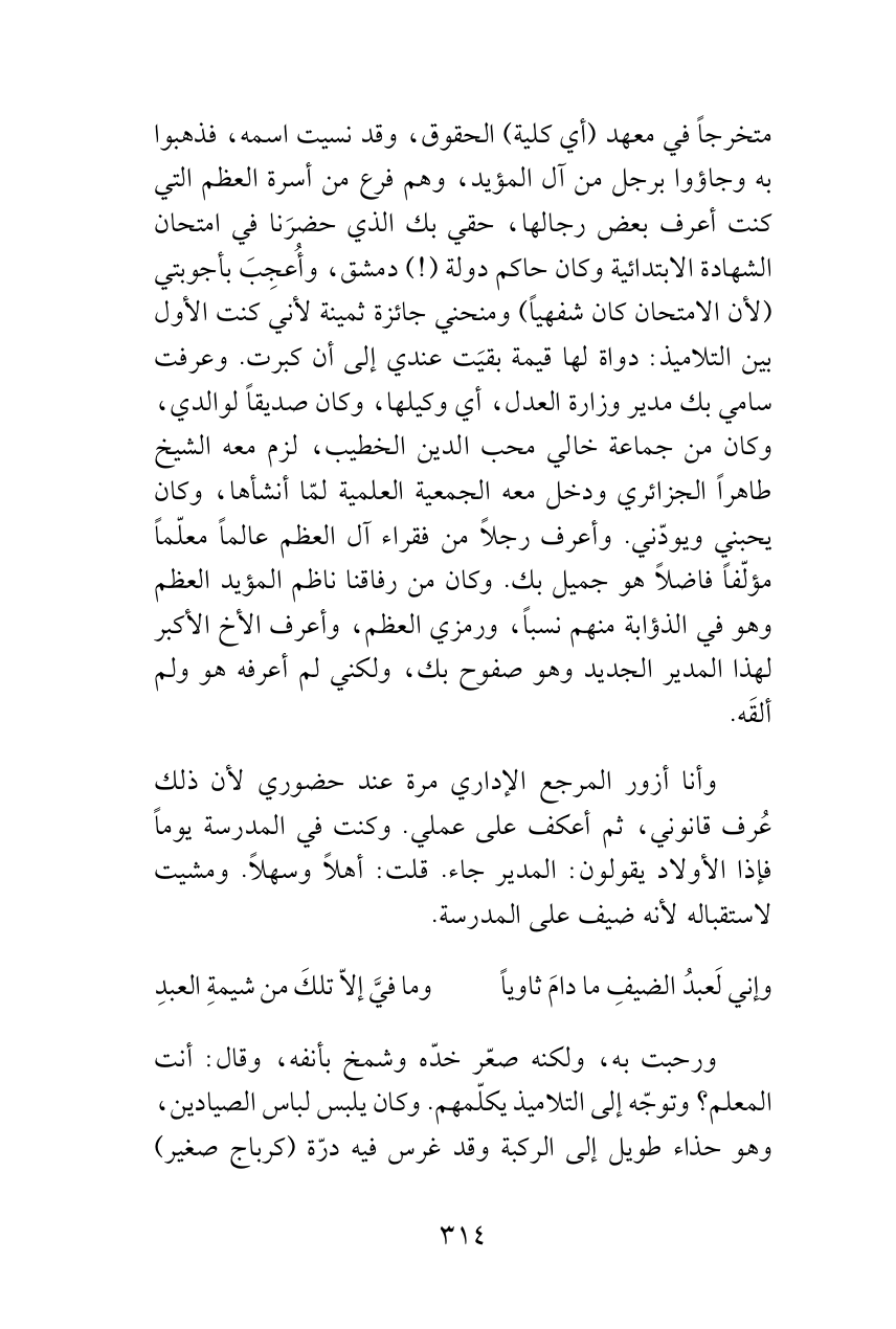 متخرجاً في معهد (أي كلية) الحقوق، وقد نسيت اسمه، فذهبوا به وجاؤوا برجل من آل المؤيد، وهم فرع من أسرة العظم التي كنت أعرف بعض رجالها، حقي بك الذي حضرَنا في امتحان الشهادة الابتدائية وكان حاكم دولة (!) دمشق، وأُعجِبَ بأجوبتي (لأن الامتحان كان شفهياً) ومنحني جائزة ثمينة لأني كنت الأول بين التلاميذ: دواة لها قيمة بقيَت عندي إلى أن كبرت. وعرفت سامي بك مدير وزارة العدل، أي وكيلها، وكان صديقاً لوالدي، وكان من جماعة خالي محب الدين الخطيب، لزم معه الشيخ طاهراً الجزائري ودخل معه الجمعية العلمية لمّا أنشأها، وكان يحبني ويودّني. وأعرف رجلاً من فقراء آل العظم عالماً معلّماً مؤلّفاً فاضلاً هو جميل بك. وكان من رفاقنا ناظم المؤيد العظم وهو في الذؤابة منهم نسباً، ورمزي العظم، وأعرف الأخ الأكبر لهذا المدير الجديد وهو صفوح بك، ولكني لم أعرفه هو ولم ألقَه.