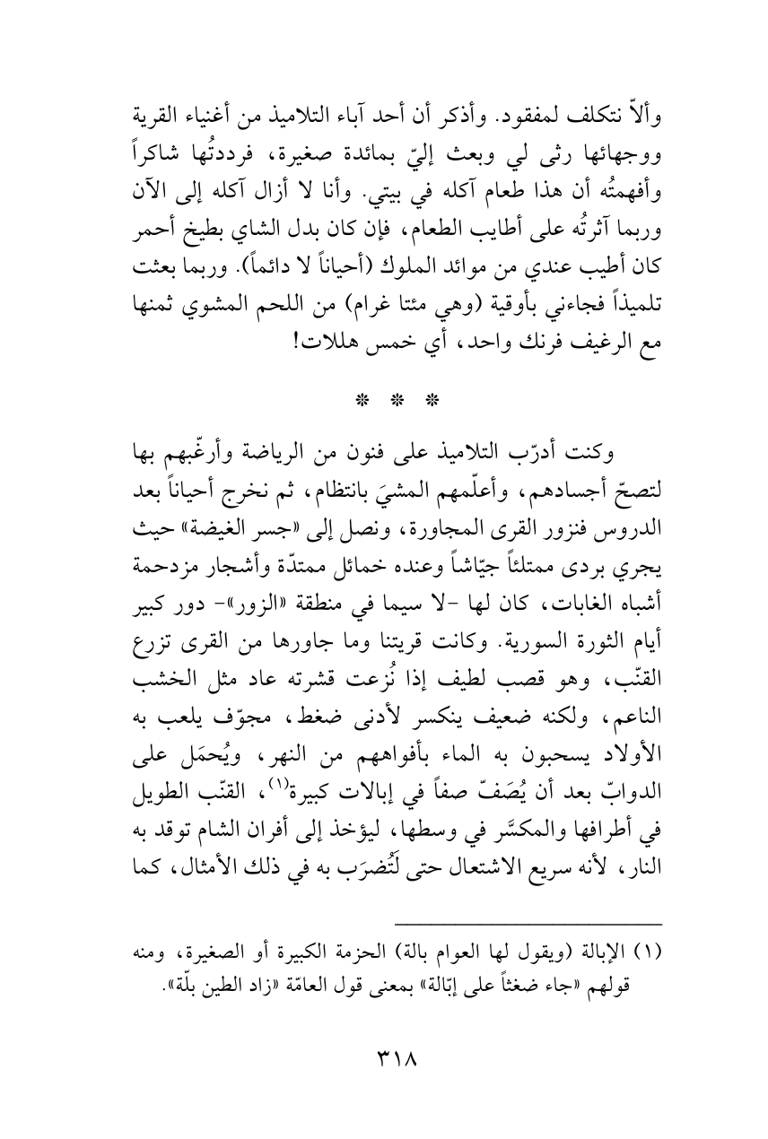 وكنت أدرّب التلاميذ على فنون من الرياضة وأرغّبهم بها لتصحّ أجسادهم، وأعلّمهم المشيَ بانتظام، ثم نخرج أحياناً بعد الدروس فنزور القرى المجاورة، ونصل إلى «جسر الغيضة» حيث يجري بردى ممتلئاً جيّاشاً وعنده خمائل ممتدّة وأشجار مزدحمة أشباه الغابات، كان لها -لا سيما في منطقة «الزور» - دور كبير أيام الثورة السورية. وكانت قريتنا وما جاورها من القرى تزرع القنّب، وهو قصب لطيف إذا نُزعت قشرته عاد مثل الخشب الناعم، ولكنه ضعيف ينكسر لأدنى ضغط، مجوّف يلعب به الأولاد يسحبون به الماء بأفواههم من النهر، ويُحمَل على الدوابّ بعد أن يُصَفّ صفاً في إبالات كبيرة (¬1)، القنّب الطويل في أطرافها والمكسَّر في وسطها، ليؤخذ إلى أفران الشام توقد به النار، لأنه سريع الاشتعال حتى لَتُضرَب به في ذلك الأمثال، كما
