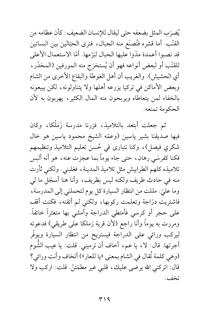ثم جعلت أبتعد بالتلاميذ، فزرنا مدرسة زَمَلْكا، وكان فيها صديقنا بشير ياسين (وعمّه الشيخ محمود ياسين هو خال شكري فيصل)، وكنا نتبارى في حُسن تعليم التلاميذ وتنظيمهم فكنا كفرسَي رهان، حتى جاء يوماً بما عجزت عنه، هو أنه ألبس تلاميذه كلهم الطرابيش مثل تلاميذ المدينة، فغلبني. ولكني ثأرت منه في حادث طريف ولكنه ليس بظريف، وأنا هنا أسجّل ما لي وما عليّ. مللت من انتظار السيارة كل يوم لتحملني إلى المدرسة، فاشتريت درّاجة وتعلمت ركوبها، ولكني لم أتقنه، فكنت أقف على حجر أو كرسي فأمتطي الدراجة وأمشي بها متعثراً خائفاً. ومررت به يوماً وأنا راجع (لأن قرية زملكا على طريقي) فدعوته ليركب ورائي على الدراجة فيستريح من انتظار السيارة ويوفّر أجرتها. قال: لا، ياعم، أخاف أن ترميني. قلت: يا عيب الشُّوم (وهي كلمة تُقال في الشام بمعنى «يا للعار») أتخاف وأنت ورائي؟ قال: اتركني الله يرضى عليك، قلبي غير مطمَئنّ. قلت: اركب ولا تخف.