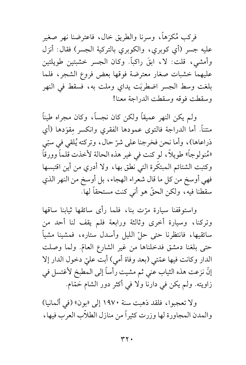 ولم يكن النهر عميقاً ولكن كان نجساً، وكان مجراه طيناً منتناً. أما الدراجة فالتوى عمودها الفقري وانكسر مِقوَدها (أي ذراعاها)، وأما نحن فخرجنا على شرّ حال، وتركته يُلقي في سبّي «مُنولوجاً» طويلاً، لو كنت في غير هذه الحالة لأخذت قلماً وورقاً وكتبت الشتائم المبتكَرة التي نطق بها، ولا أدري من أين اقتبسها فهي أوسخ من كل ما قال شعراء الهجاء، بل أوسخ من النهر الذي سقطنا فيه، ولكن الحقّ هو أني كنت مستحقاً لها.