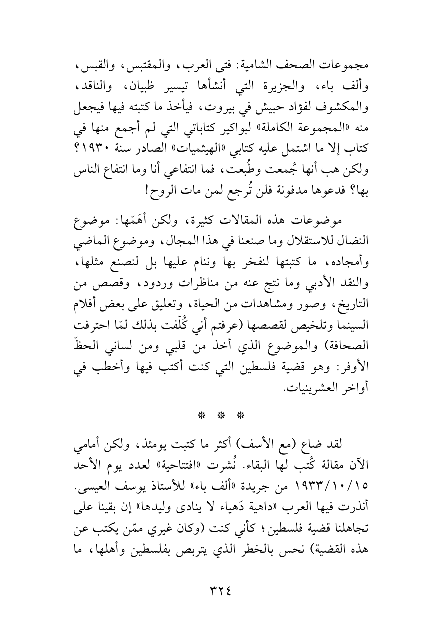 مجموعات الصحف الشامية: فتى العرب، والمقتبس، والقبس، وألف باء، والجزيرة التي أنشأها تيسير ظبيان، والناقد، والمكشوف لفؤاد حبيش في بيروت، فيأخذ ما كتبته فيها فيجعل منه «المجموعة الكاملة» لبواكير كتاباتي التي لم أجمع منها في كتاب إلا ما اشتمل عليه كتابي «الهيثميات» الصادر سنة 1930؟ ولكن هب أنها جُمعت وطُبعت، فما انتفاعي أنا وما انتفاع الناس بها؟ فدعوها مدفونة فلن تُرجع لمن مات الروح!