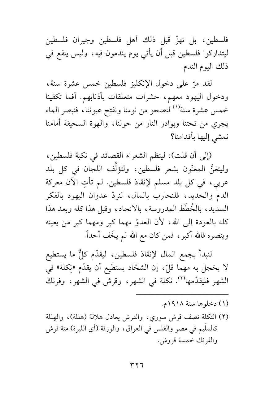 لنبدأ بجمع المال لإنقاذ فلسطين، ليقدّم كلٌّ ما يستطيع لا يخجل به مهما قلّ، إن الشحّاد يستطيع أن يقدّم «نِكلة» في الشهر فليقدّمها (¬2). نكلة في الشهر، وقرش في الشهر، وفرنك