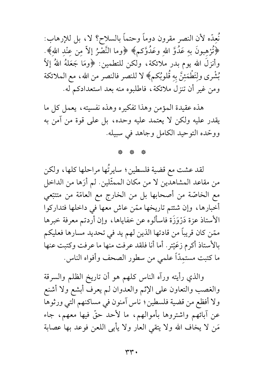 والذي رأيته ورآه الناس كلهم هو أن تاريخ الظلم والسرقة والغصب والتعاون على الإثم والعدوان لم يعرف أبشع ولا أشنع ولا أفظع من قضية فلسطين؛ ناس آمنون في مساكنهم التي ورثوها عن آبائهم واشتروها بأموالهم، ما لأحد حقّ فيها معهم، جاء مَن لا يخاف الله ولا يتقي العار ولا يأبى اللعن فوعد بها عصابة