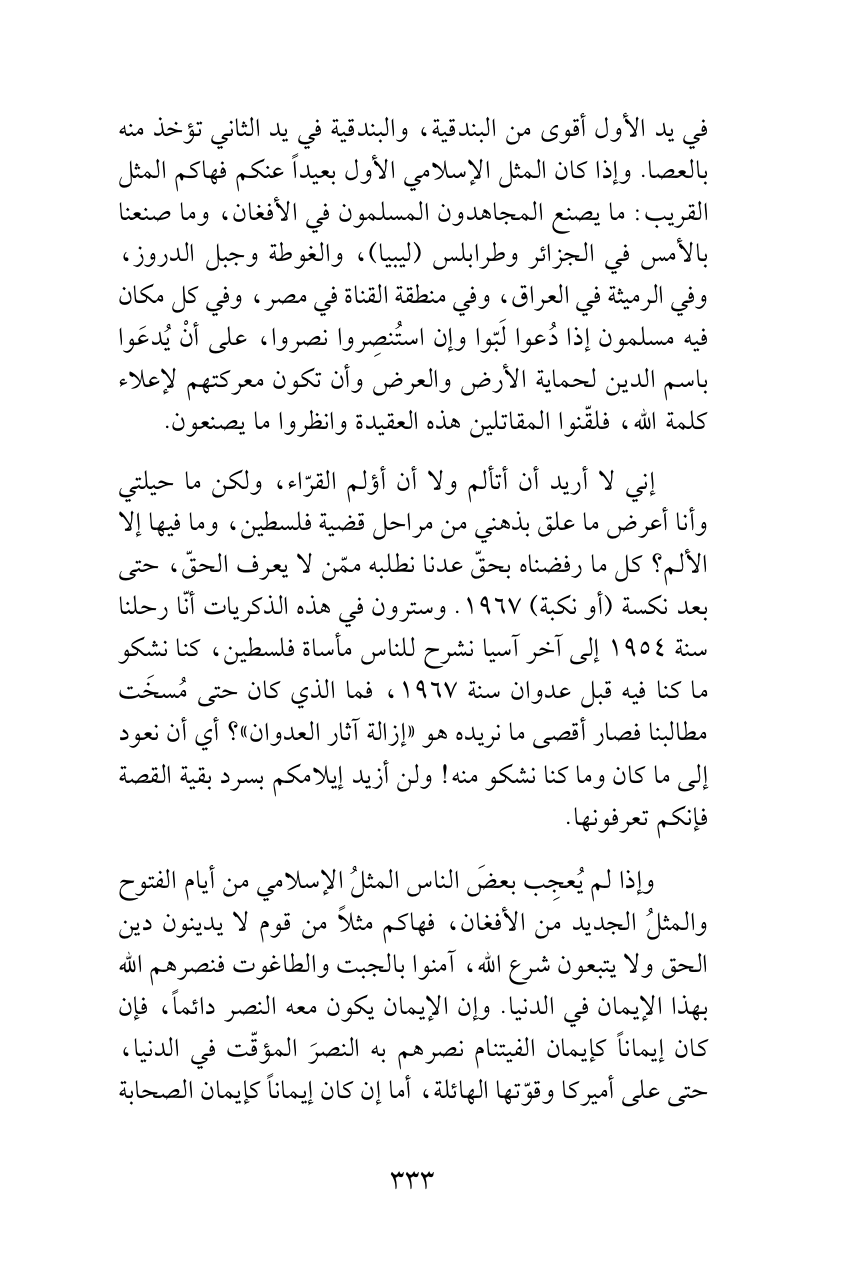 في يد الأول أقوى من البندقية، والبندقية في يد الثاني تؤخذ منه بالعصا. وإذا كان المثل الإسلامي الأول بعيداً عنكم فهاكم المثل القريب: ما يصنع المجاهدون المسلمون في الأفغان، وما صنعنا بالأمس في الجزائر وطرابلس (ليبيا)، والغوطة وجبل الدروز، وفي الرميثة في العراق، وفي منطقة القناة في مصر، وفي كل مكان فيه مسلمون إذا دُعوا لَبّوا وإن استُنصِروا نصروا، على أنْ يُدعَوا باسم الدين لحماية الأرض والعرض وأن تكون معركتهم لإعلاء كلمة الله، فلقّنوا المقاتلين هذه العقيدة وانظروا ما يصنعون.