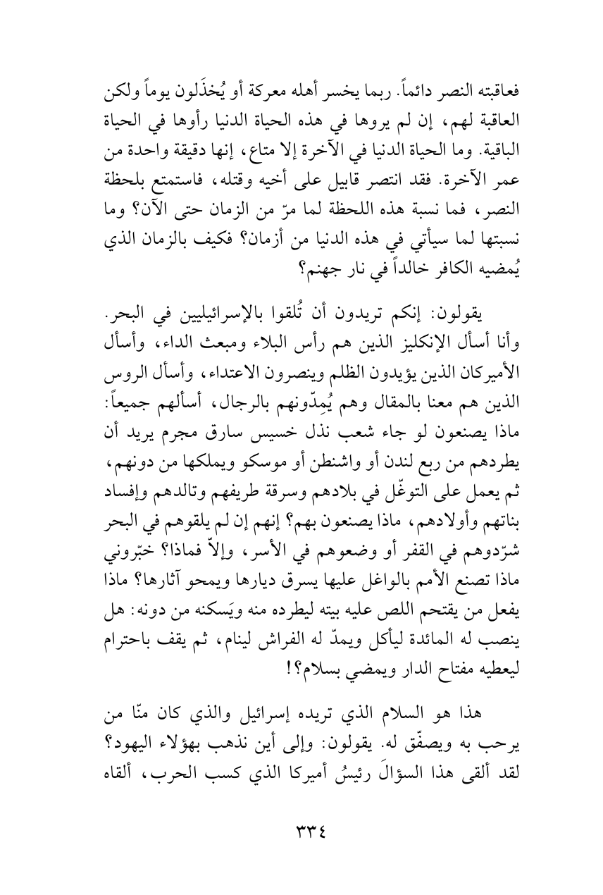 يقولون: إنكم تريدون أن تُلقوا بالإسرائيليين في البحر. وأنا أسأل الإنكليز الذين هم رأس البلاء ومبعث الداء، وأسأل الأميركان الذين يؤيدون الظلم وينصرون الاعتداء، وأسأل الروس الذين هم معنا بالمقال وهم يُمِدّونهم بالرجال، أسألهم جميعاً: ماذا يصنعون لو جاء شعب نذل خسيس سارق مجرم يريد أن يطردهم من ربع لندن أو واشنطن أو موسكو ويملكها من دونهم، ثم يعمل على التوغّل في بلادهم وسرقة طريفهم وتالدهم وإفساد بناتهم وأولادهم، ماذا يصنعون بهم؟ إنهم إن لم يلقوهم في البحر شرّدوهم في القفر أو وضعوهم في الأسر، وإلاّ فماذا؟ خبّروني ماذا تصنع الأمم بالواغل عليها يسرق ديارها ويمحو آثارها؟ ماذا يفعل من يقتحم اللص عليه بيته ليطرده منه ويَسكنه من دونه: هل ينصب له المائدة ليأكل ويمدّ له الفراش لينام، ثم يقف باحترام ليعطيه مفتاح الدار ويمضي بسلام؟!