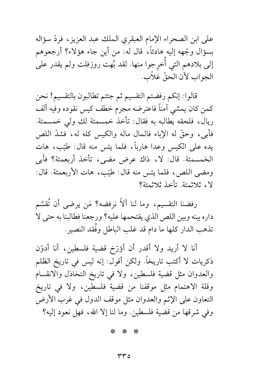 أنا لا أريد ولا أقدر أن أؤرّخ قضية فلسطين، أنا أدوّن ذكريات لا أكتب تاريخاً. ولكن أقول: إنه ليس في تاريخ الظلم والعدوان مثل قضية فلسطين، ولا في تاريخ التخاذل والانقسام وقلة الاهتمام مثل موقفنا من قضية فلسطين، ولا في تاريخ التعاون على الإثم والعدوان مثل موقف الدول في غرب الأرض وفي شرقها من قضية فلسطين. وما لنا إلا الله، فهل نعود إليه؟