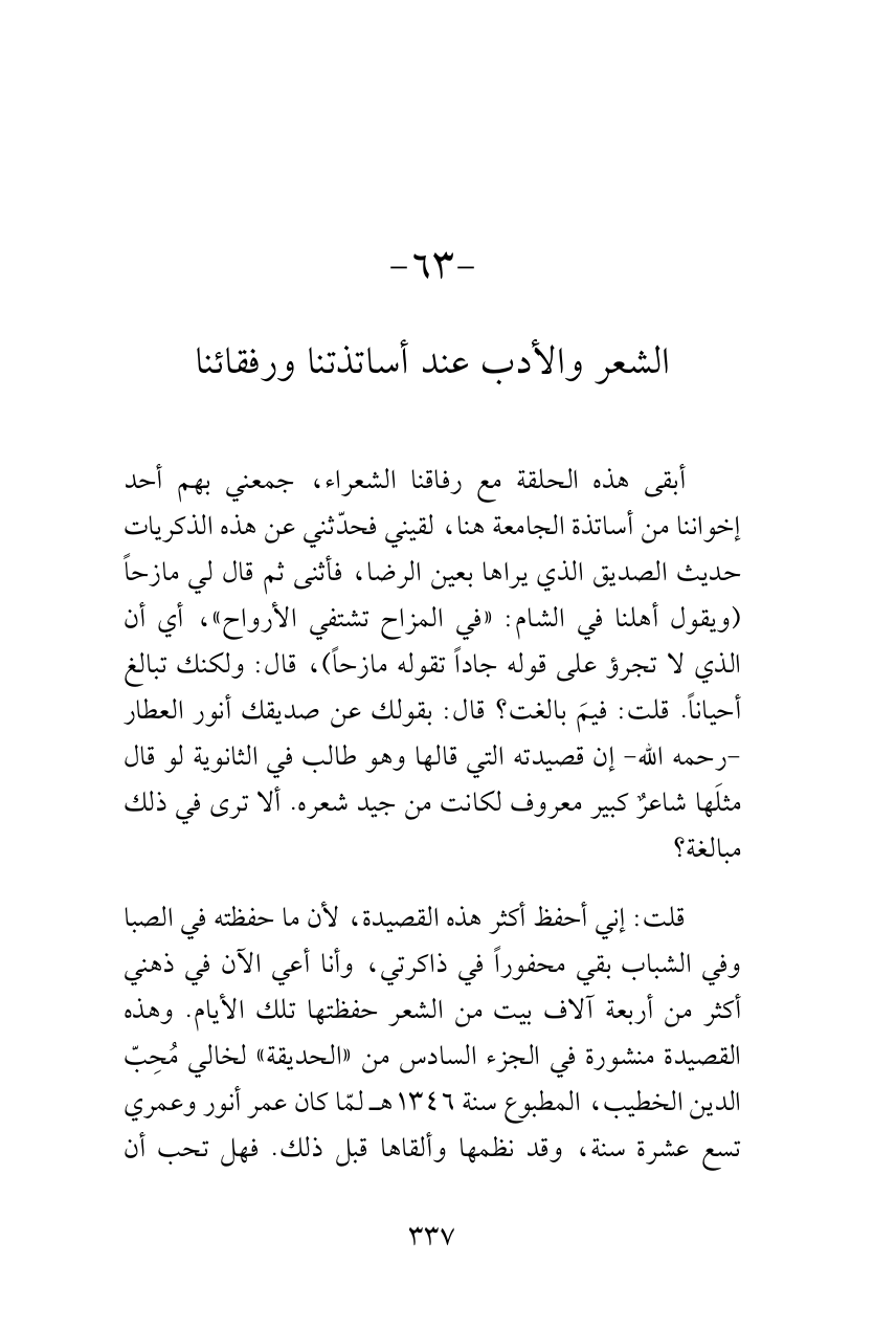 أبقى هذه الحلقة مع رفاقنا الشعراء، جمعني بهم أحد إخواننا من أساتذة الجامعة هنا، لقيني فحدّثني عن هذه الذكريات حديث الصديق الذي يراها بعين الرضا، فأثنى ثم قال لي مازحاً (ويقول أهلنا في الشام: «في المزاح تشتفي الأرواح»، أي أن الذي لا تجرؤ على قوله جاداً تقوله مازحاً)، قال: ولكنك تبالغ أحياناً. قلت: فيمَ بالغت؟ قال: بقولك عن صديقك أنور العطار -رحمه الله- إن قصيدته التي قالها وهو طالب في الثانوية لو قال مثلَها شاعرٌ كبير معروف لكانت من جيد شعره. ألا ترى في ذلك مبالغة؟