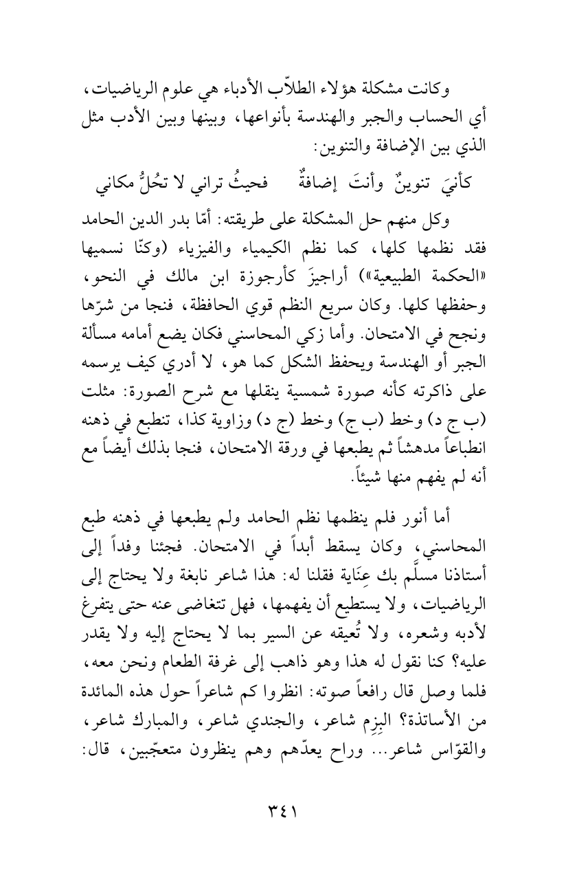وكانت مشكلة هؤلاء الطلاّب الأدباء هي علوم الرياضيات، أي الحساب والجبر والهندسة بأنواعها، وبينها وبين الأدب مثل الذي بين الإضافة والتنوين:
