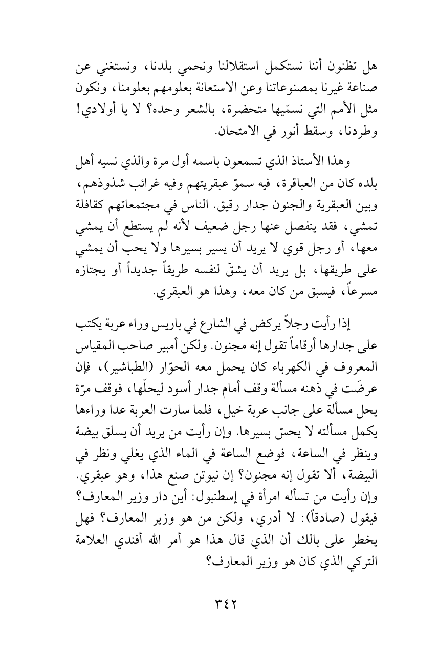إذا رأيت رجلاً يركض في الشارع في باريس وراء عربة يكتب على جدارها أرقاماً تقول إنه مجنون. ولكن أمبير صاحب المقياس المعروف في الكهرباء كان يحمل معه الحوّار (الطباشير)، فإن عرضَت في ذهنه مسألة وقف أمام جدار أسود ليحلّها، فوقف مرّة يحل مسألة على جانب عربة خيل، فلما سارت العربة عدا وراءها يكمل مسألته لا يحسّ بسيرها. وإن رأيت من يريد أن يسلق بيضة وينظر في الساعة، فوضع الساعة في الماء الذي يغلي ونظر في البيضة، ألا تقول إنه مجنون؟ إن نيوتن صنع هذا، وهو عبقري. وإن رأيت من تسأله امرأة في إسطنبول: أين دار وزير المعارف؟ فيقول (صادقاً): لا أدري، ولكن من هو وزير المعارف؟ فهل يخطر على بالك أن الذي قال هذا هو أمر الله أفندي العلامة التركي الذي كان هو وزير المعارف؟