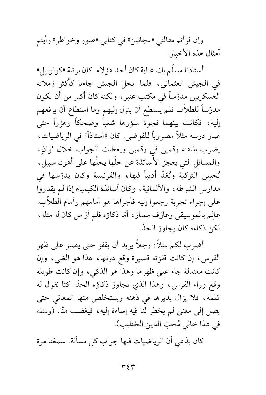 أستاذنا مسلّم بك عناية كان أحد هؤلاء. كان برتبة «كولونيل» في الجيش العثماني، فلما انحلّ الجيش جاءنا كأكثر زملائه العسكريين مدرّساً في مكتب عنبر، ولكنه كان أكبر من أن يكون مدرّساً للطلاّب فلم يستطع أن ينزل إليهم وما استطاع أن يرفعهم إليه، فكانت بينهما فجوة ملؤوها شغباً وضحكاً وهزراً حتى صار درسه مثلاً مضروباً للفوضى. كان «أستاذاً» في الرياضيات، يضرب بذهنه رقمين في رقمين ويعطيك الجواب خلال ثوانٍ، والمسائل التي يعجز الأساتذة عن حلّها يحلّها على أهون سبيل، يُحسِن التركية ويُعَدّ أديباً فيها، والفرنسية وكان يدرّسها في مدارس الشرطة، والألمانية، وكان أساتذة الكيمياء إذا لم يقدروا على إجراء تجرِبة رجعوا إليه فأجراها هو أمامهم وأمام الطلاّب. عالِم بالموسيقى وعازف ممتاز، أمّا ذكاؤه فلم أرَ من كان له مثله، لكن ذكاءه كان يجاوز الحدّ.