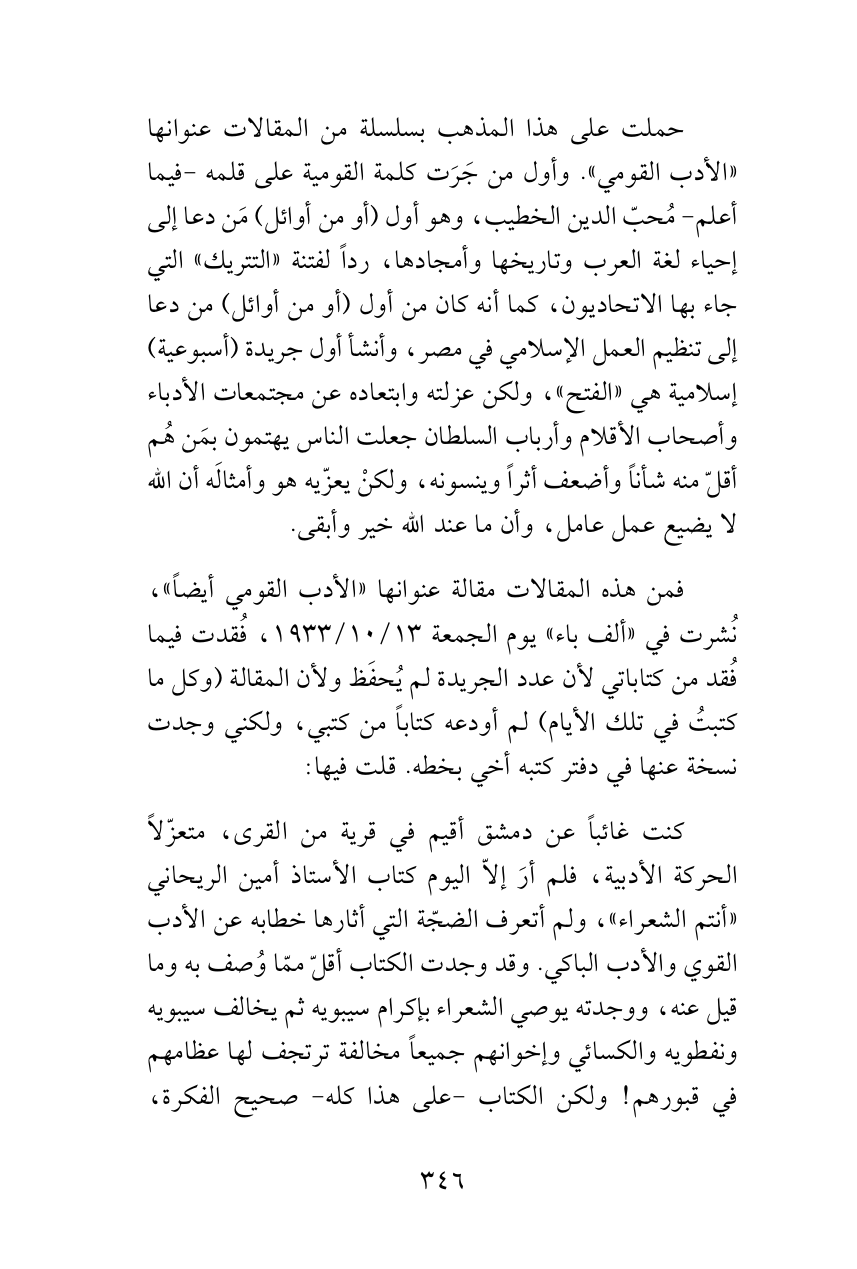 حملت على هذا المذهب بسلسلة من المقالات عنوانها «الأدب القومي». وأول من جَرَت كلمة القومية على قلمه -فيما أعلم- مُحبّ الدين الخطيب، وهو أول (أو من أوائل) مَن دعا إلى إحياء لغة العرب وتاريخها وأمجادها، رداً لفتنة «التتريك» التي جاء بها الاتحاديون، كما أنه كان من أول (أو من أوائل) من دعا إلى تنظيم العمل الإسلامي في مصر، وأنشأ أول جريدة (أسبوعية) إسلامية هي «الفتح»، ولكن عزلته وابتعاده عن مجتمعات الأدباء وأصحاب الأقلام وأرباب السلطان جعلت الناس يهتمون بمَن هُم أقلّ منه شأناً وأضعف أثراً وينسونه، ولكنْ يعزّيه هو وأمثالَه أن الله لا يضيع عمل عامل، وأن ما عند الله خير وأبقى.