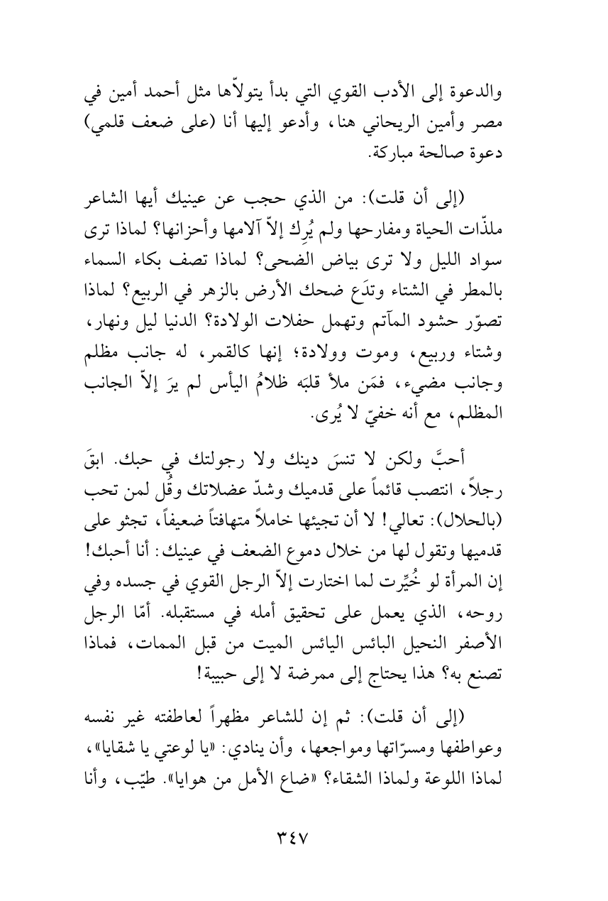 والدعوة إلى الأدب القوي التي بدأ يتولاّها مثل أحمد أمين في مصر وأمين الريحاني هنا، وأدعو إليها أنا (على ضعف قلمي) دعوة صالحة مباركة.
