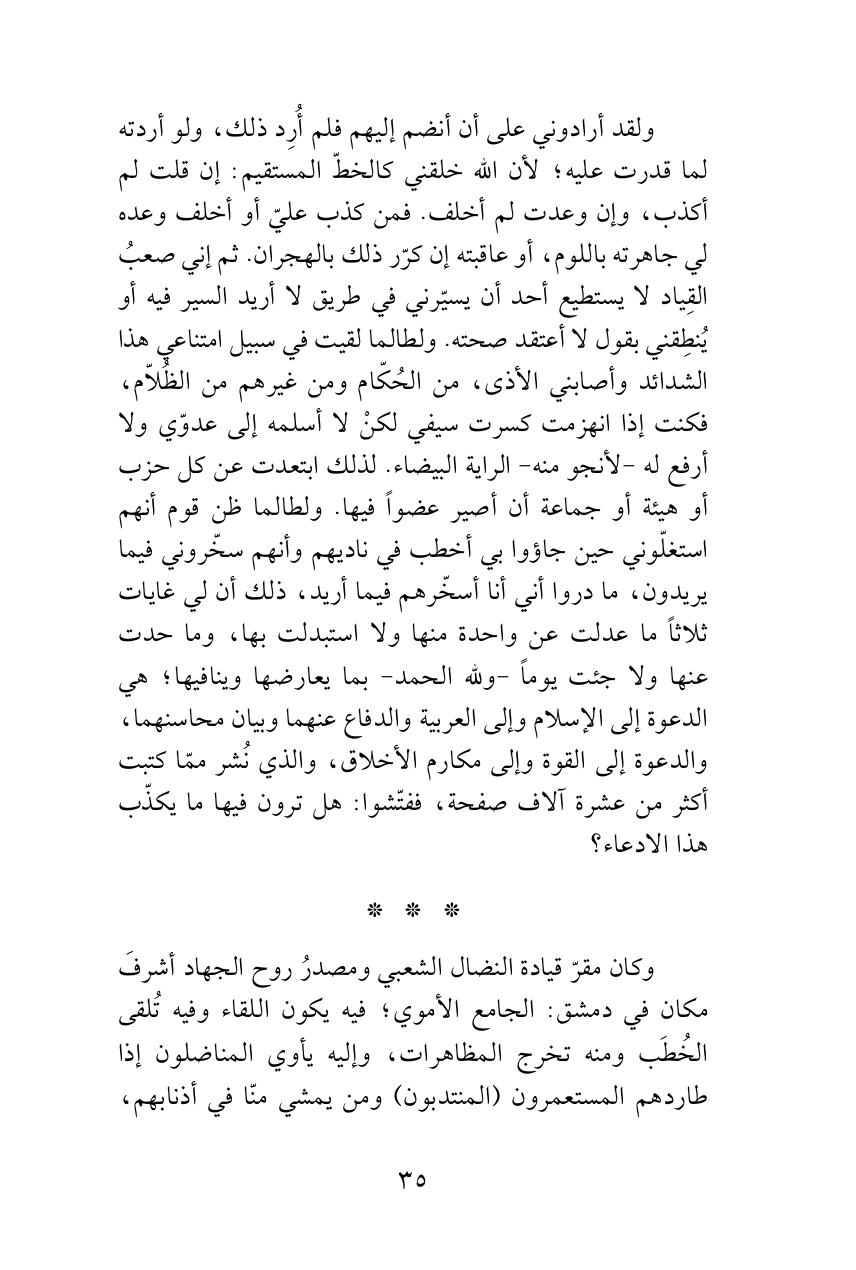 وكان مقرّ قيادة النضال الشعبي ومصدرُ روح الجهاد أشرفَ مكان في دمشق: الجامع الأموي؛ فيه يكون اللقاء وفيه تُلقى الخُطَب ومنه تخرج المظاهرات، وإليه يأوي المناضلون إذا طاردهم المستعمرون (المنتدبون) ومن يمشي منّا في أذنابهم،
