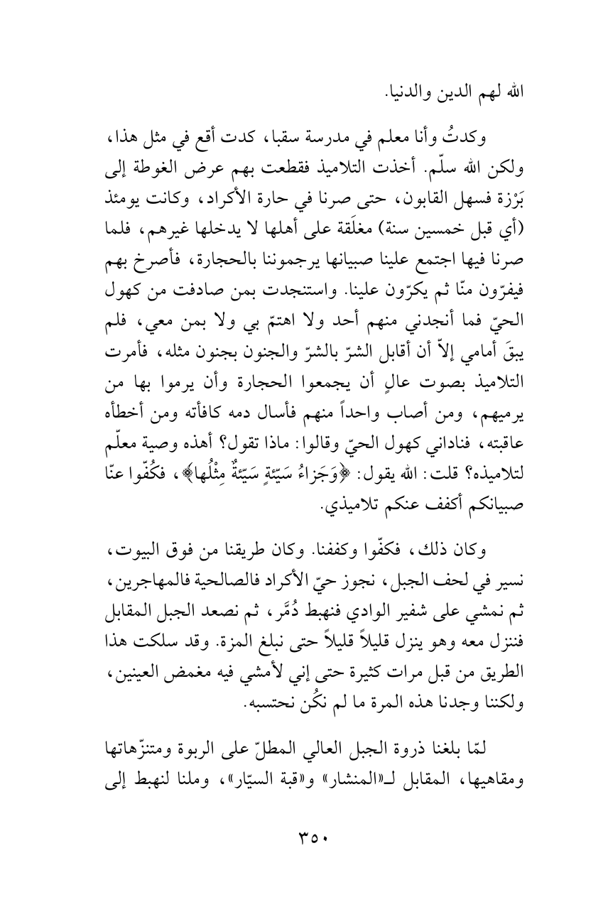 وكدتُ وأنا معلم في مدرسة سقبا، كدت أقع في مثل هذا، ولكن الله سلّم. أخذت التلاميذ فقطعت بهم عرض الغوطة إلى بَرْزة فسهل القابون، حتى صرنا في حارة الأكراد، وكانت يومئذ (أي قبل خمسين سنة) مغلَقة على أهلها لا يدخلها غيرهم، فلما صرنا فيها اجتمع علينا صبيانها يرجموننا بالحجارة، فأصرخ بهم فيفرّون منّا ثم يكرّون علينا. واستنجدت بمن صادفت من كهول الحيّ فما أنجدني منهم أحد ولا اهتمّ بي ولا بمن معي، فلم يبقَ أمامي إلاّ أن أقابل الشرّ بالشرّ والجنون بجنون مثله، فأمرت التلاميذ بصوت عالٍ أن يجمعوا الحجارة وأن يرموا بها من يرميهم، ومن أصاب واحداً منهم فأسال دمه كافأته ومن أخطأه عاقبته، فناداني كهول الحيّ وقالوا: ماذا تقول؟ أهذه وصية معلّم لتلاميذه؟ قلت: الله يقول: {وَجَزاءُ سَيّئةٍ سَيّئةٌ مِثْلُها}، فكُفّوا عنّا صبيانكم أكفف عنكم تلاميذي.