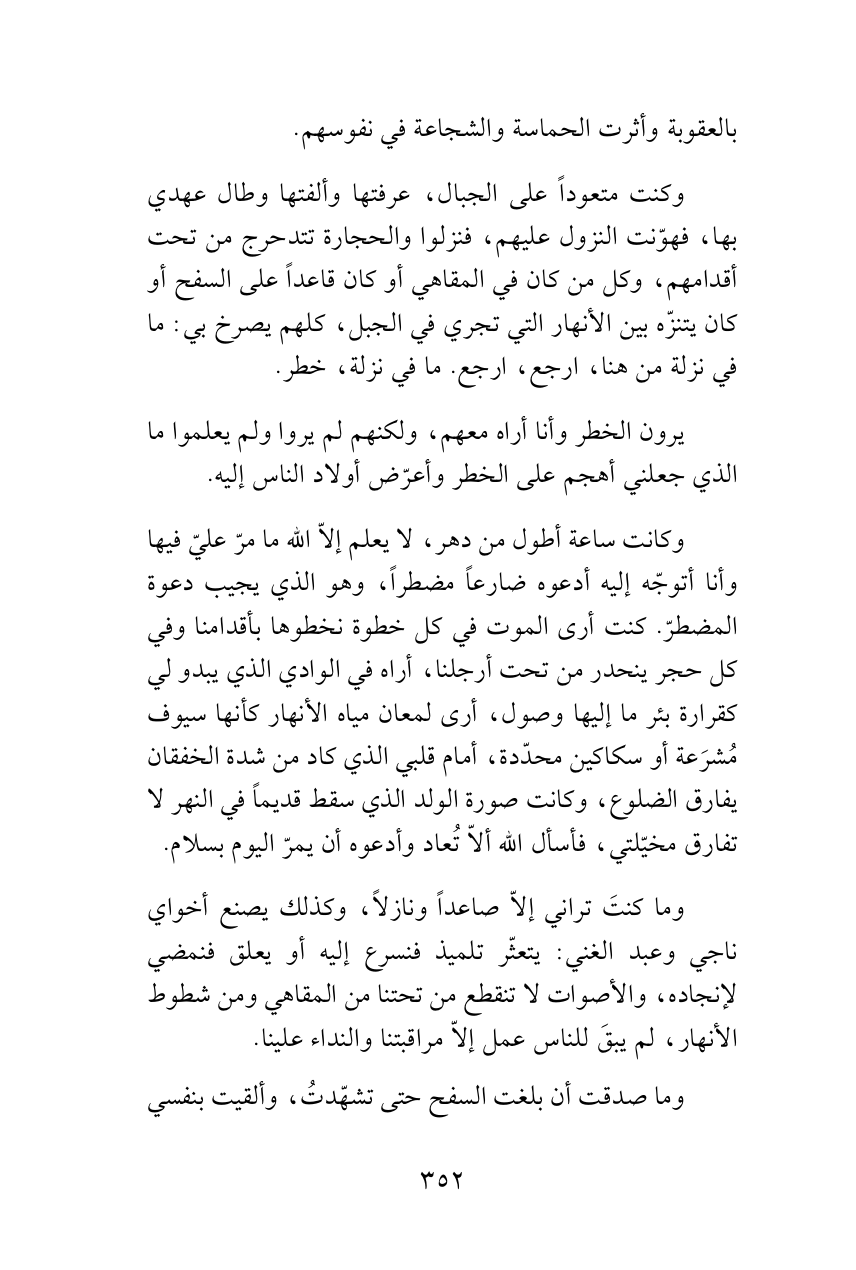 وكانت ساعة أطول من دهر، لا يعلم إلاّ الله ما مرّ عليّ فيها وأنا أتوجّه إليه أدعوه ضارعاً مضطراً، وهو الذي يجيب دعوة المضطرّ. كنت أرى الموت في كل خطوة نخطوها بأقدامنا وفي كل حجر ينحدر من تحت أرجلنا، أراه في الوادي الذي يبدو لي كقرارة بئر ما إليها وصول، أرى لمعان مياه الأنهار كأنها سيوف مُشرَعة أو سكاكين محدّدة، أمام قلبي الذي كاد من شدة الخفقان يفارق الضلوع، وكانت صورة الولد الذي سقط قديماً في النهر لا تفارق مخيّلتي، فأسأل الله ألاّ تُعاد وأدعوه أن يمرّ اليوم بسلام.