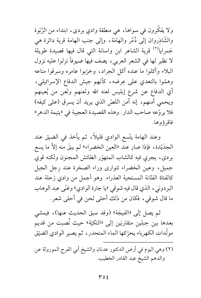 ولا يفكّرون في سواها، هي منطقة وادي بردى، ابتداء من الرَّبْوة والشّاذِروان إلى دُمَّر والهامَة، وإلى جنب الهامة قرية داثرة هي جَمرايا (¬2) قرية الشاعر ابن واسانة التي قال فيها قصيدة طويلة لا نظير لها في الشعر العربي، يصف فيها ضيوفاً نزلوا عليه نزول البلاء وأكلوا ما عنده أكل الجراد، وخرّبوا عامره وسرقوا متاعه وهمّوا بالتعدي على عِرضه، كأنهم جيش الدفاع الإسرائيلي، أي الدفاع عن شرع إبليس لعنه الله ولعنهم ولعن من يُعينهم ويحمي أمنهم، إنه أمن اللصّ الذي يريد أن يسرق (على كيفه) فلا يروّعه صاحب الدار. وهذه القصيدة العجيبة في «يتيمة الدهر» فاقرؤوها.
