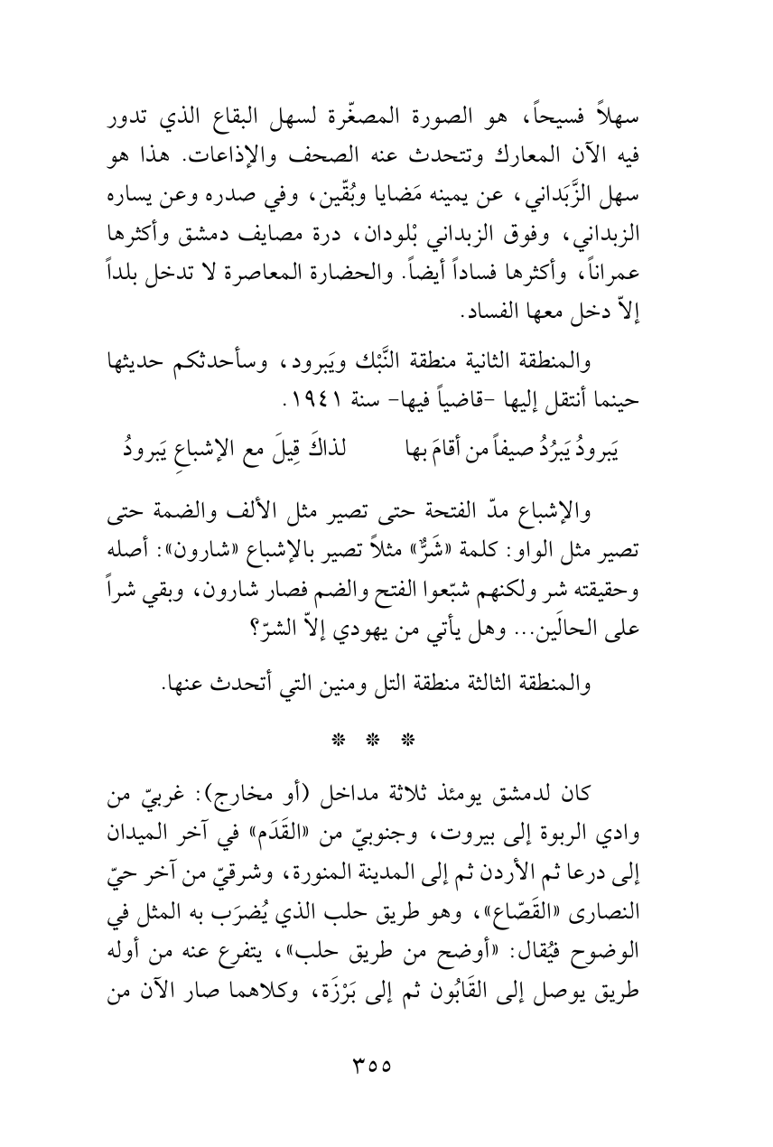 سهلاً فسيحاً، هو الصورة المصغّرة لسهل البقاع الذي تدور فيه الآن المعارك وتتحدث عنه الصحف والإذاعات. هذا هو سهل الزَّبَداني، عن يمينه مَضايا وبُقّين، وفي صدره وعن يساره الزبداني، وفوق الزبداني بْلودان، درة مصايف دمشق وأكثرها عمراناً، وأكثرها فساداً أيضاً. والحضارة المعاصرة لا تدخل بلداً إلاّ دخل معها الفساد.