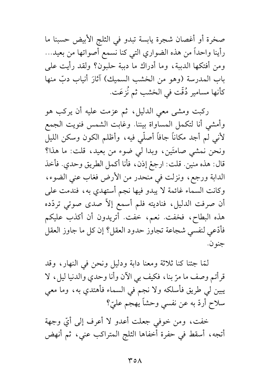 ركبت ومشى معي الدليل، ثم عزمت عليه أن يركب هو وأمشي أنا لتكمل المساواة بيننا. وغابت الشمس فنويت الجمع لأني لم أجد مكاناً جافاً أصلّي فيه، وأظلم الكون وسكن الليل ونحن نمشي صامتَين، وبدا لي ضوء من بعيد، قلت: ما هذا؟ قال: هذه منين. قلت: ارجعْ إذن، فأنا أكمل الطريق وحدي. فأخذ الدابة ورجع، ونزلت في منحدر من الأرض فغاب عني الضوء، وكانت السماء غائمة لايبدو فيها نجم أستهدي به، فندمت على أن صرفت الدليل، فناديته فلم أسمع إلاّ صدى صوتي تردّده هذه البطاح، فخفت. نعم، خفت. أتريدون أن أكذب عليكم فأدّعي لنفسي شجاعة تجاوز حدود العقل؟ إن كل ما جاوز العقل جنون.