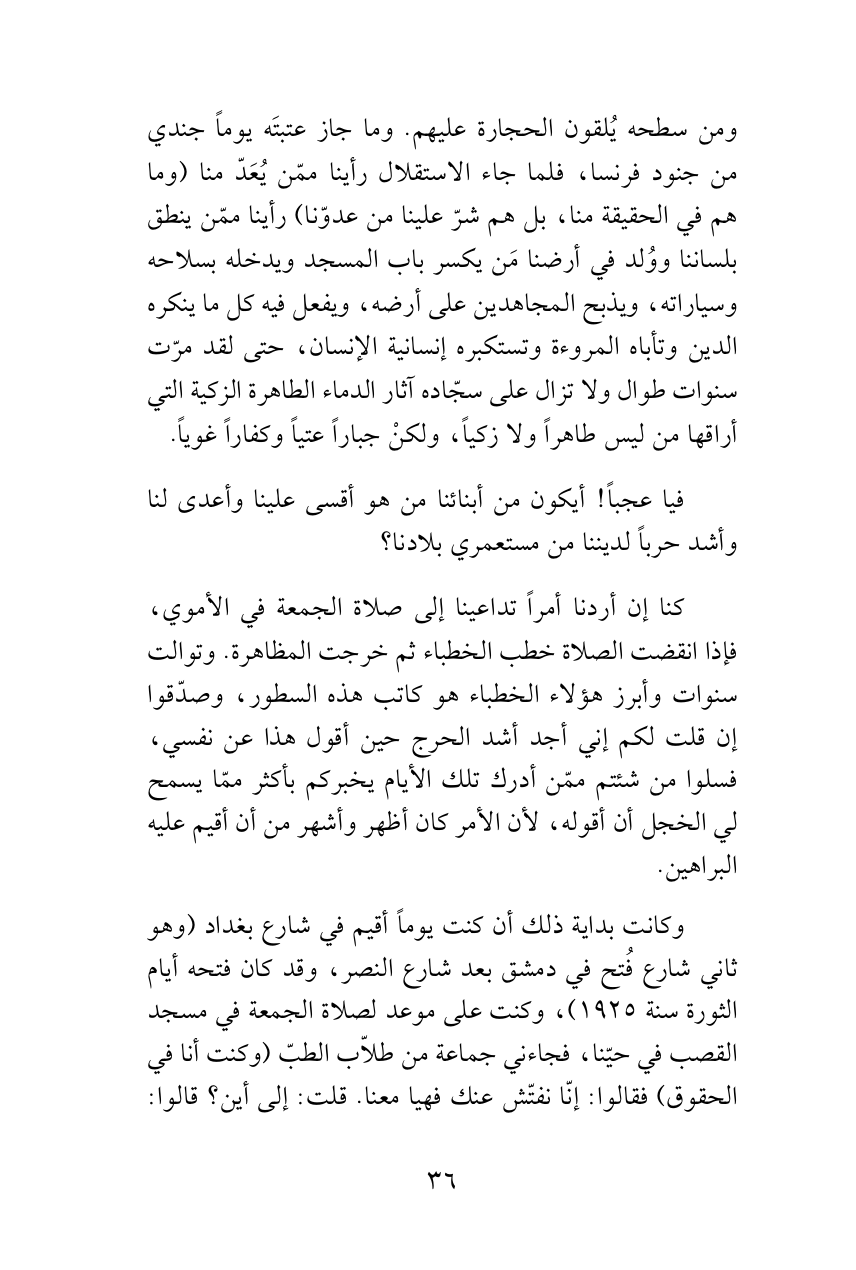 ومن سطحه يُلقون الحجارة عليهم. وما جاز عتبتَه يوماً جندي من جنود فرنسا، فلما جاء الاستقلال رأينا ممّن يُعَدّ منا (وما هم في الحقيقة منا، بل هم شرّ علينا من عدوّنا) رأينا ممّن ينطق بلساننا ووُلد في أرضنا مَن يكسر باب المسجد ويدخله بسلاحه وسياراته، ويذبح المجاهدين على أرضه، ويفعل فيه كل ما ينكره الدين وتأباه المروءة وتستكبره إنسانية الإنسان، حتى لقد مرّت سنوات طوال ولا تزال على سجّاده آثار الدماء الطاهرة الزكية التي أراقها من ليس طاهراً ولا زكياً، ولكنْ جباراً عتياً وكفاراً غوياً.