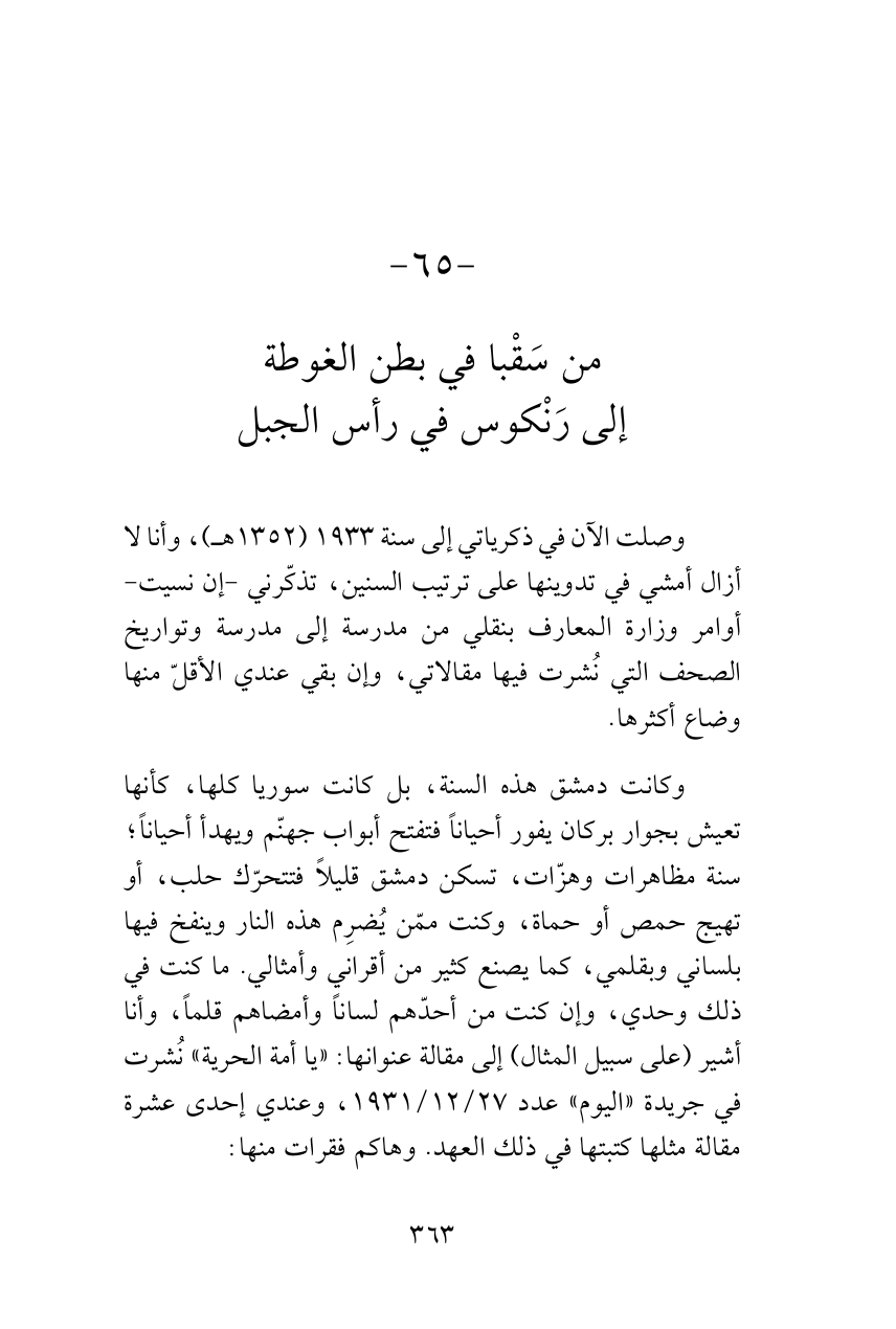 وصلت الآن في ذكرياتي إلى سنة 1933 (1352هـ)، وأنا لا أزال أمشي في تدوينها على ترتيب السنين، تذكّرني -إن نسيت- أوامر وزارة المعارف بنقلي من مدرسة إلى مدرسة وتواريخ الصحف التي نُشرت فيها مقالاتي، وإن بقي عندي الأقلّ منها وضاع أكثرها.