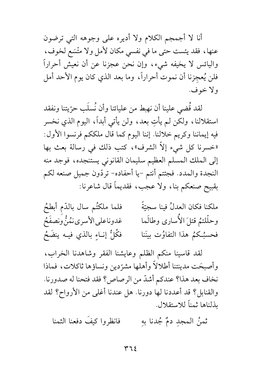 لقد قُضي علينا أن نهبط من عليائنا وأن نُسلَب حرّيتنا ونفقد استقلالنا، ولكن لم يأتِ بعد، ولن يأتي أبداً، اليوم الذي نخسر فيه إيماننا وكريم خلالنا. إننا اليوم كما قال ملككم فرنسوا الأول: «خسرنا كل شيء إلاّ الشرف»، كتب ذلك في رسالة بعث بها إلى الملك المسلم العظيم سليمان القانوني يستنجده، فوجد منه النجدة والمدد. فجئتم أنتم -يا أحفاده- تردّون جميل صنعه لكم بقبيح صنعكم بنا، ولا عجب، فقديماً قال شاعرنا: