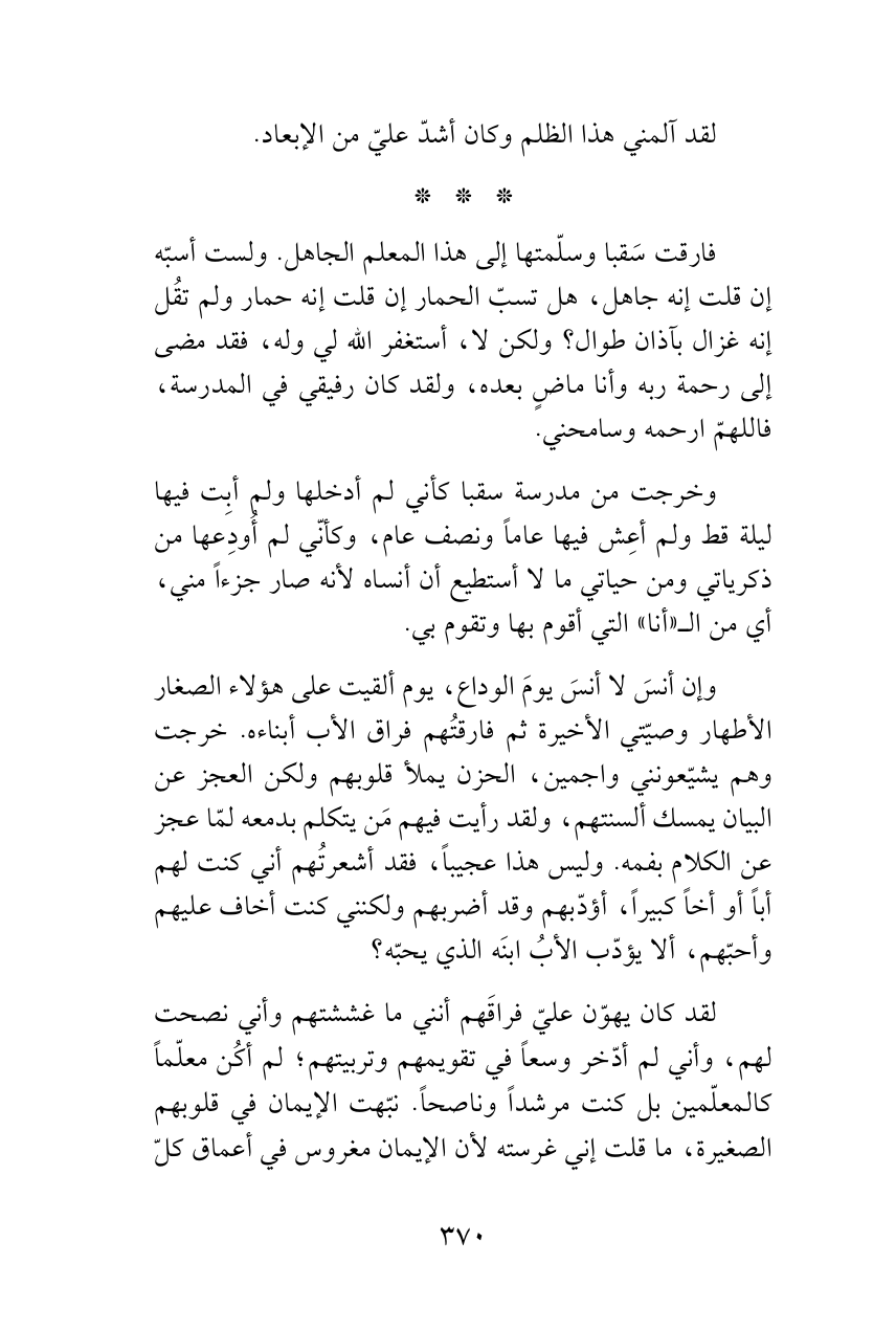 وإن أنسَ لا أنسَ يومَ الوداع، يوم ألقيت على هؤلاء الصغار الأطهار وصيّتي الأخيرة ثم فارقتُهم فراق الأب أبناءه. خرجت وهم يشيّعونني واجمين، الحزن يملأ قلوبهم ولكن العجز عن البيان يمسك ألسنتهم، ولقد رأيت فيهم مَن يتكلم بدمعه لمّا عجز عن الكلام بفمه. وليس هذا عجيباً، فقد أشعرتُهم أني كنت لهم أباً أو أخاً كبيراً، أؤدّبهم وقد أضربهم ولكنني كنت أخاف عليهم وأحبّهم، ألا يؤدّب الأبُ ابنَه الذي يحبّه؟
