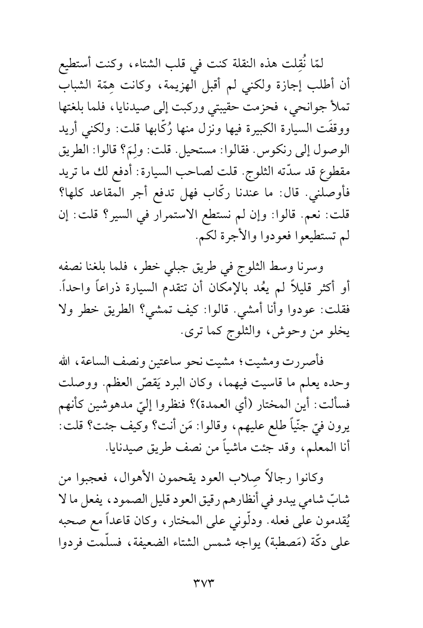 فأصررت ومشيت؛ مشيت نحو ساعتين ونصف الساعة، الله وحده يعلم ما قاسيت فيهما، وكان البرد يَقصّ العظم. ووصلت فسألت: أين المختار (أي العمدة)؟ فنظروا إليّ مدهوشين كأنهم يرون فيّ جنّياً طلع عليهم، وقالوا: مَن أنت؟ وكيف جئت؟ قلت: أنا المعلم، وقد جئت ماشياً من نصف طريق صيدنايا.