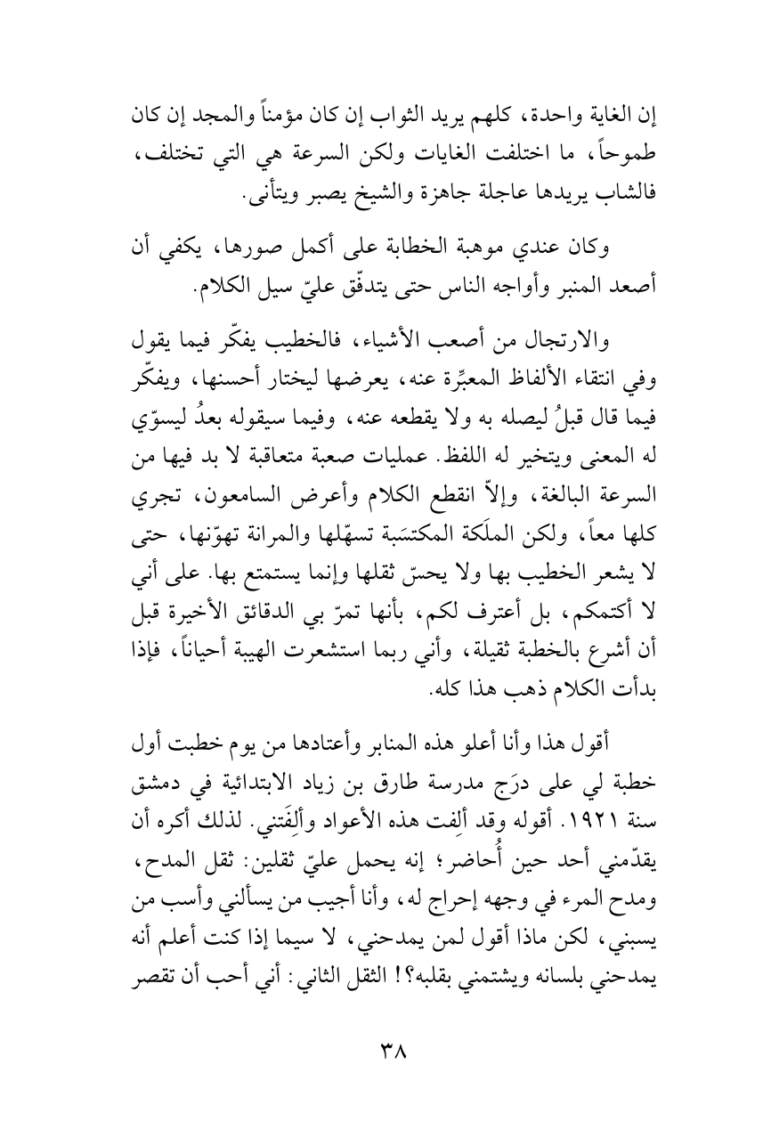 والارتجال من أصعب الأشياء، فالخطيب يفكّر فيما يقول وفي انتقاء الألفاظ المعبِّرة عنه، يعرضها ليختار أحسنها، ويفكّر فيما قال قبلُ ليصله به ولا يقطعه عنه، وفيما سيقوله بعدُ ليسوّي له المعنى ويتخير له اللفظ. عمليات صعبة متعاقبة لا بد فيها من السرعة البالغة، وإلاّ انقطع الكلام وأعرض السامعون، تجري كلها معاً، ولكن الملَكة المكتسَبة تسهّلها والمرانة تهوّنها، حتى لا يشعر الخطيب بها ولا يحسّ ثقلها وإنما يستمتع بها. على أني لا أكتمكم، بل أعترف لكم، بأنها تمرّ بي الدقائق الأخيرة قبل أن أشرع بالخطبة ثقيلة، وأني ربما استشعرت الهيبة أحياناً، فإذا بدأت الكلام ذهب هذا كله.