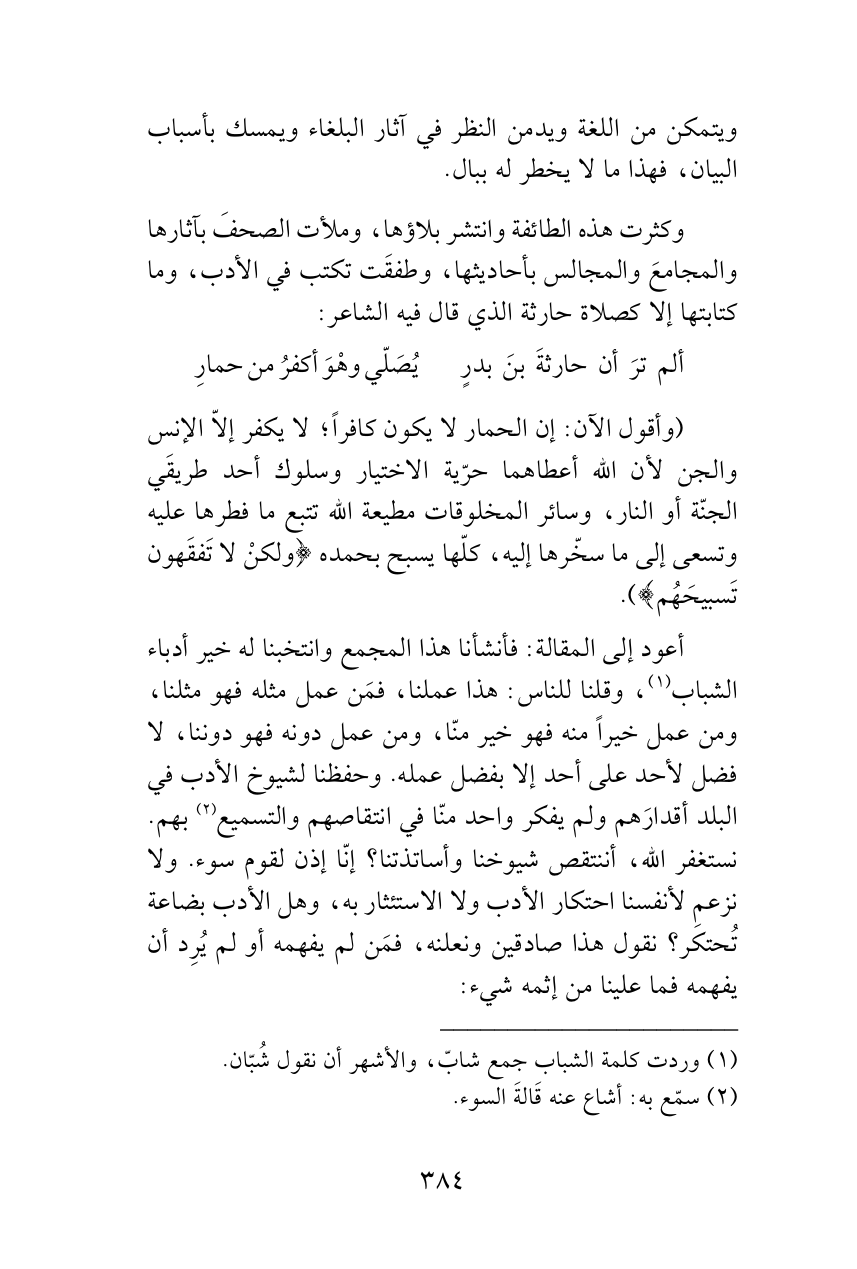 وكثرت هذه الطائفة وانتشر بلاؤها، وملأت الصحفَ بآثارها والمجامعَ والمجالس بأحاديثها، وطفقَت تكتب في الأدب، وما كتابتها إلا كصلاة حارثة الذي قال فيه الشاعر: