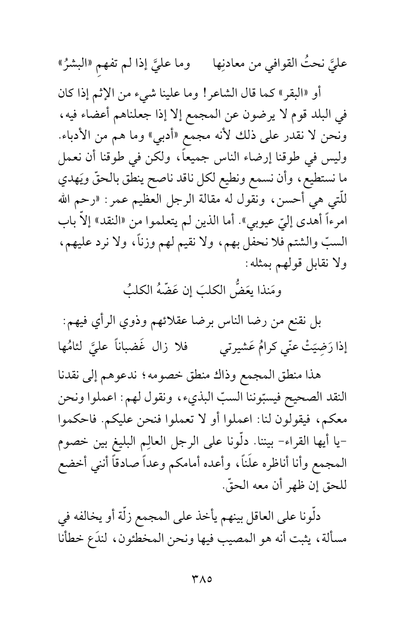 أو «البقر» كما قال الشاعر! وما علينا شيء من الإثم إذا كان في البلد قوم لايرضون عن المجمع إلا إذا جعلناهم أعضاء فيه، ونحن لا نقدر على ذلك لأنه مجمع «أدبي» وما هم من الأدباء. وليس في طوقنا إرضاء الناس جميعاً، ولكن في طوقنا أن نعمل ما نستطيع، وأن نسمع ونطيع لكل ناقد ناصح ينطق بالحقّ ويَهدي للّتي هي أحسن، ونقول له مقالة الرجل العظيم عمر: «رحم الله امرءاً أهدى إليّ عيوبي». أما الذين لم يتعلموا من «النقد» إلاّ باب السبّ والشتم فلا نحفل بهم، ولا نقيم لهم وزناً، ولا نرد عليهم، ولا نقابل قولهم بمثله: