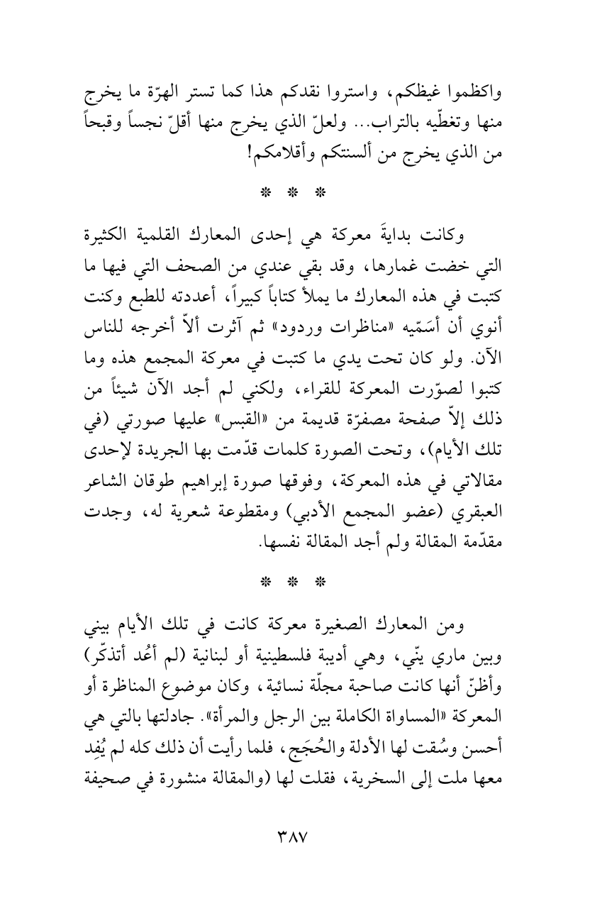 ومن المعارك الصغيرة معركة كانت في تلك الأيام بيني وبين ماري ينّي، وهي أديبة فلسطينية أو لبنانية (لم أعُد أتذكّر) وأظنّ أنها كانت صاحبة مجلّة نسائية، وكان موضوع المناظرة أو المعركة «المساواة الكاملة بين الرجل والمرأة». جادلتها بالتي هي أحسن وسُقت لها الأدلة والحُجَج، فلما رأيت أن ذلك كله لم يُفِد معها ملت إلى السخرية، فقلت لها (والمقالة منشورة في صحيفة