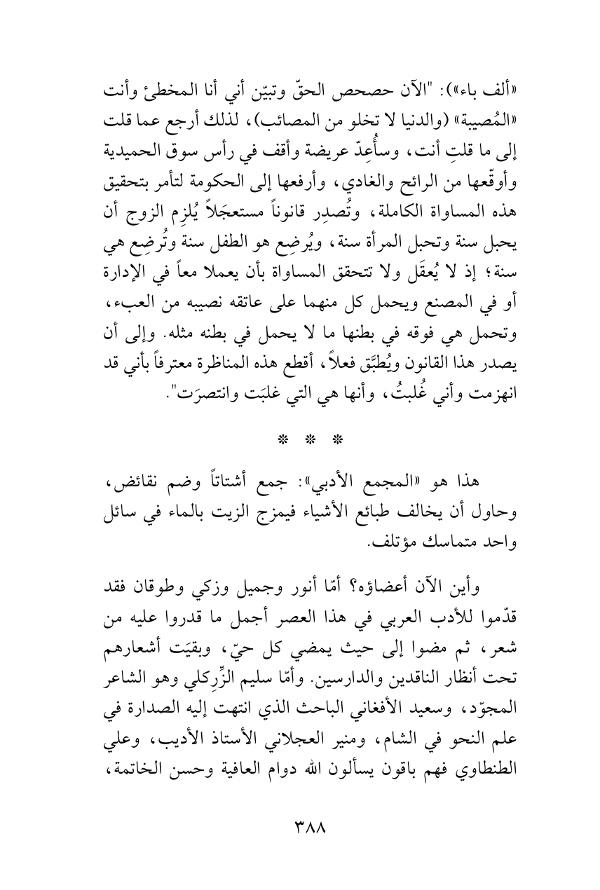 «ألف باء»): "الآن حصحص الحقّ وتبيّن أني أنا المخطئ وأنت «المُصيبة» (والدنيا لا تخلو من المصائب)، لذلك أرجع عما قلت إلى ما قلتِ أنت، وسأُعِدّ عريضة وأقف في رأس سوق الحميدية وأوقّعها من الرائح والغادي، وأرفعها إلى الحكومة لتأمر بتحقيق هذه المساواة الكاملة، وتُصدِر قانوناً مستعجَلاً يُلزِم الزوج أن يحبل سنة وتحبل المرأة سنة، ويُرضِع هو الطفل سنة وتُرضِع هي سنة؛ إذ لا يُعقَل ولا تتحقق المساواة بأن يعملا معاً في الإدارة أو في المصنع ويحمل كل منهما على عاتقه نصيبه من العبء، وتحمل هي فوقه في بطنها ما لا يحمل في بطنه مثله. وإلى أن يصدر هذا القانون ويُطبَّق فعلاً، أقطع هذه المناظرة معترفاً بأني قد انهزمت وأني غُلبتُ، وأنها هي التي غلبَت وانتصرَت".
