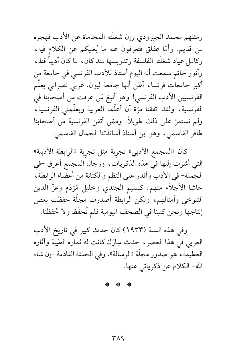 ومثلهم محمد الجيرودي وإن شغلَته المحاماة عن الأدب فهجره من قديم. وأمّا عفلق فتعرفون عنه ما يُغنيكم عن الكلام فيه، وكامل عياد شغلَته الفلسفة وتدريسها منذ كان، ما كان أديباً قط، وأنور حاتم سمعت أنه اليوم أستاذ للأدب الفرنسي في جامعة من أكبر جامعات فرنسا، أظن أنها جامعة ليون. عربي نصراني يعلّم الفرنسيين الأدب الفرنسي! وهو أنبغ مَن عرفت من أصحابنا في الفرنسية، ولقد اتفقنا مرّة أن أعلّمه العربية ويعلّمني الفرنسية، ولم نستمرّ على ذلك طويلاً. وممّن أتقن الفرنسية من أصحابنا ظافر القاسمي، وهو ابن أستاذ أساتذتنا الجمال القاسمي.