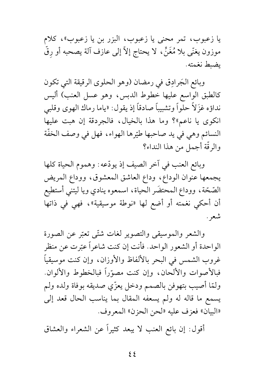 وبائع العنب في آخر الصيف إذ يودّعه: وهموم الحياة كلها يجمعها عنوان الوداع، وداع العاشق المعشوق، ووداع المريض الصّحّة، ووداع المحتضَر الحياة، اسمعوه ينادي ويا ليتني أستطيع أن أحكي نغمته أو أضع لها «نوطة موسيقية»، فهي في ذاتها شعر.