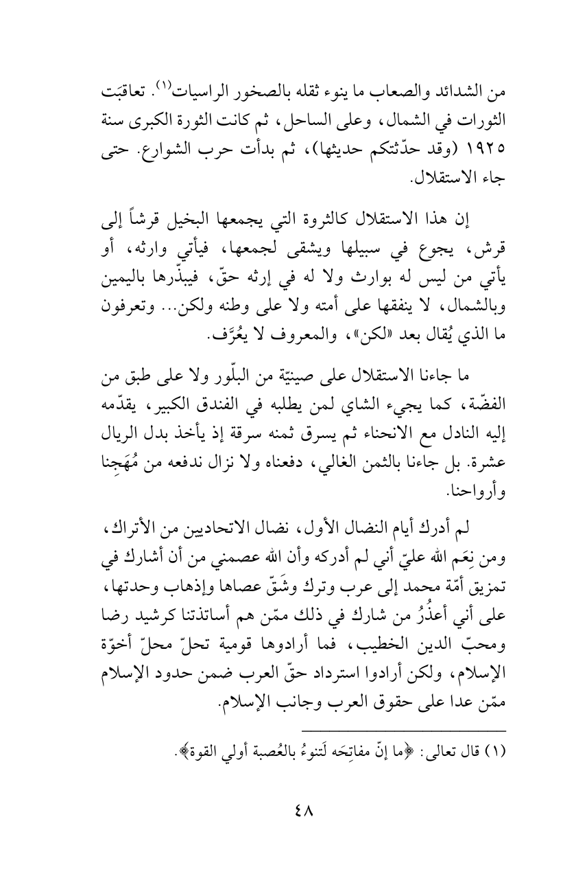 إن هذا الاستقلال كالثروة التي يجمعها البخيل قرشاً إلى قرش، يجوع في سبيلها ويشقى لجمعها، فيأتي وارثه، أو يأتي من ليس له بوارث ولا له في إرثه حقّ، فيبذّرها باليمين وبالشمال، لا ينفقها على أمته ولا على وطنه ولكن ... وتعرفون ما الذي يُقال بعد «لكن»، والمعروف لا يعُرَّف.
