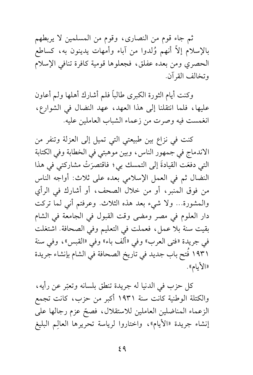 كنت في نزاع بين طبيعتي التي تميل إلى العزلة وتنفر من الاندماج في جمهور الناس، وبين موهبتي في الخطابة وفي الكتابة التي دفعَت القيادةَ إلى التمسك بي؛ فاقتصرَتْ مشاركتي في هذا النضال ثم في العمل الإسلامي بعده على ثلاث: أواجه الناس من فوق المنبر، أو من خلال الصحف، أو أشارك في الرأي والمشورة ... ولا شيء بعد هذه الثلاث. وعرفتم أني لما تركت دار العلوم في مصر ومضى وقت القبول في الجامعة في الشام بقيت سنة بلا عمل، فعملت في التعليم وفي الصحافة. اشتغلت في جريدة «فتى العرب» وفي «ألف باء» وفي «القبس»، وفي سنة 1931 فُتح باب جديد في تاريخ الصحافة في الشام بإنشاء جريدة «الأيام».
