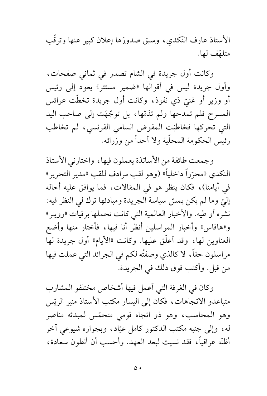 وجمعت طائفة من الأساتذة يعملون فيها، واختارني الأستاذ النكدي «محرّراً داخلياً» (وهو لقب مرادف للقب «مدير التحرير» في أيامنا)، فكان ينظر هو في المقالات، فما يوافق عليه أحاله إليّ وما لم يكن يمسّ سياسة الجريدة ومبادئها ترك لي النظر فيه: نشره أو طيه. والأخبار العالمية التي كانت تحملها برقيات «رويتر» و «هافاس» وأخبار المراسلين أنظر أنا فيها، فأختار منها وأضع العناوين لها، وقد أعلّق عليها. وكانت «الأيام» أول جريدة لها مراسلون حقاً، لا كالذي وصفتُه لكم في الجرائد التي عملت فيها من قبل. وأكتب فوق ذلك في الجريدة.