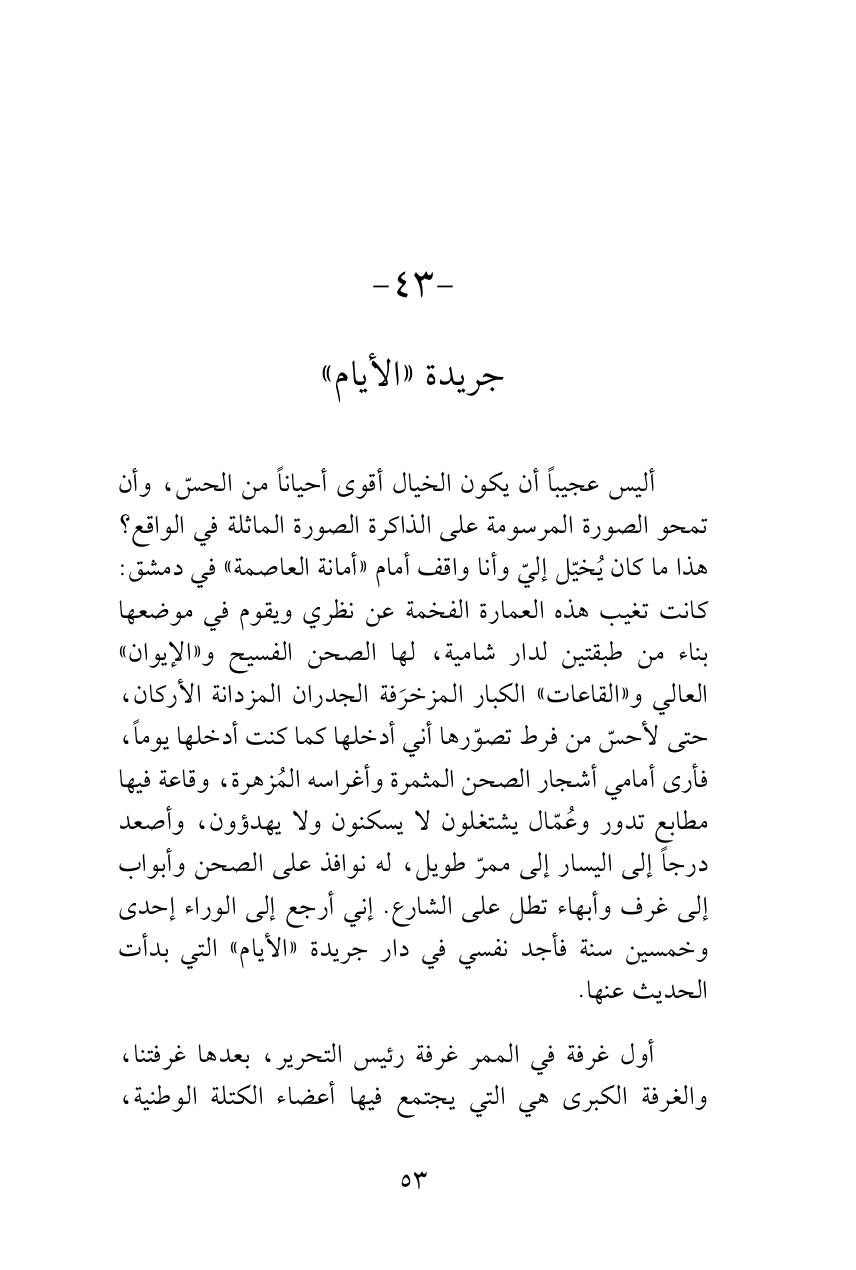 أليس عجيباً أن يكون الخيال أقوى أحياناً من الحسّ، وأن تمحو الصورة المرسومة على الذاكرة الصورة الماثلة في الواقع؟ هذا ما كان يُخيّل إليّ وأنا واقف أمام «أمانة العاصمة» في دمشق: كانت تغيب هذه العمارة الفخمة عن نظري ويقوم في موضعها بناء من طبقتين لدار شامية، لها الصحن الفسيح و «الإيوان» العالي و «القاعات» الكبار المزخرَفة الجدران المزدانة الأركان، حتى لأحسّ من فرط تصوّرها أني أدخلها كما كنت أدخلها يوماً، فأرى أمامي أشجار الصحن المثمرة وأغراسه المُزهرة، وقاعة فيها مطابع تدور وعُمّال يشتغلون لا يسكنون ولا يهدؤون، وأصعد درجاً إلى اليسار إلى ممرّ طويل، له نوافذ على الصحن وأبواب إلى غرف وأبهاء تطل على الشارع. إني أرجع إلى الوراء إحدى وخمسين سنة فأجد نفسي في دار جريدة «الأيام» التي بدأت الحديث عنها.