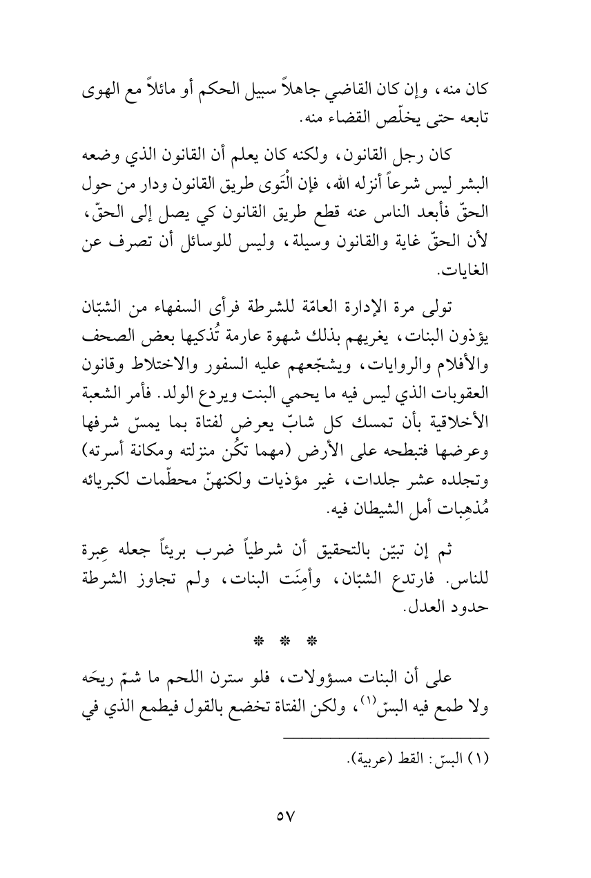ثم إن تبيّن بالتحقيق أن شرطياً ضرب بريئاً جعله عِبرة للناس. فارتدع الشبّان، وأمِنَت البنات، ولم تجاوز الشرطة حدود العدل.